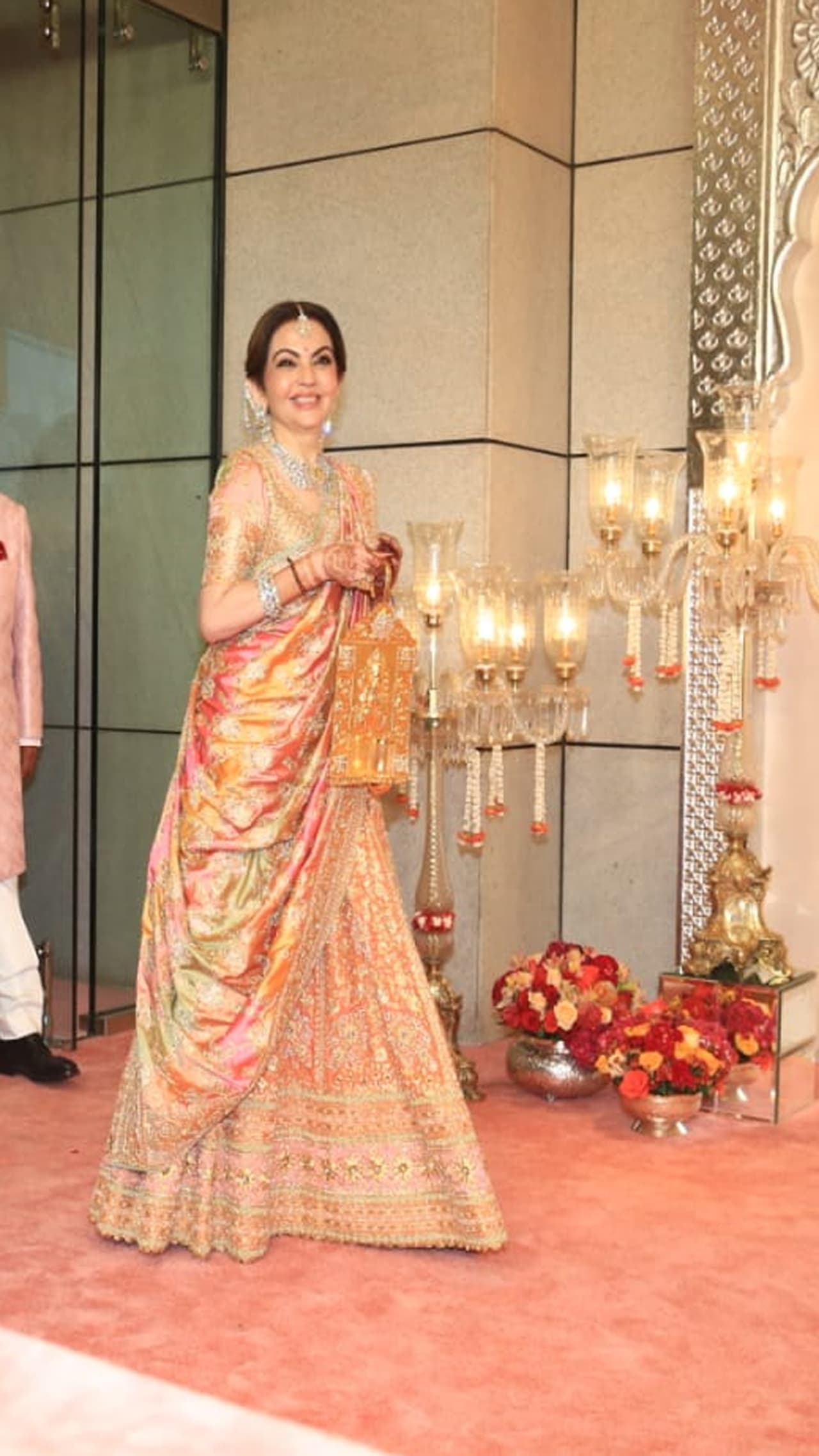 நிதா அம்பானி, தன்னுடைய ஆனந்தின் திருமணத்திற்கு 100 காரட் மஞ்சள் வைரத்தால் உருவாக்கப்பட்ட நெக்லஸ் அணிந்து அனைவரது பார்வையையும் கவர்ந்துள்ளார்.
