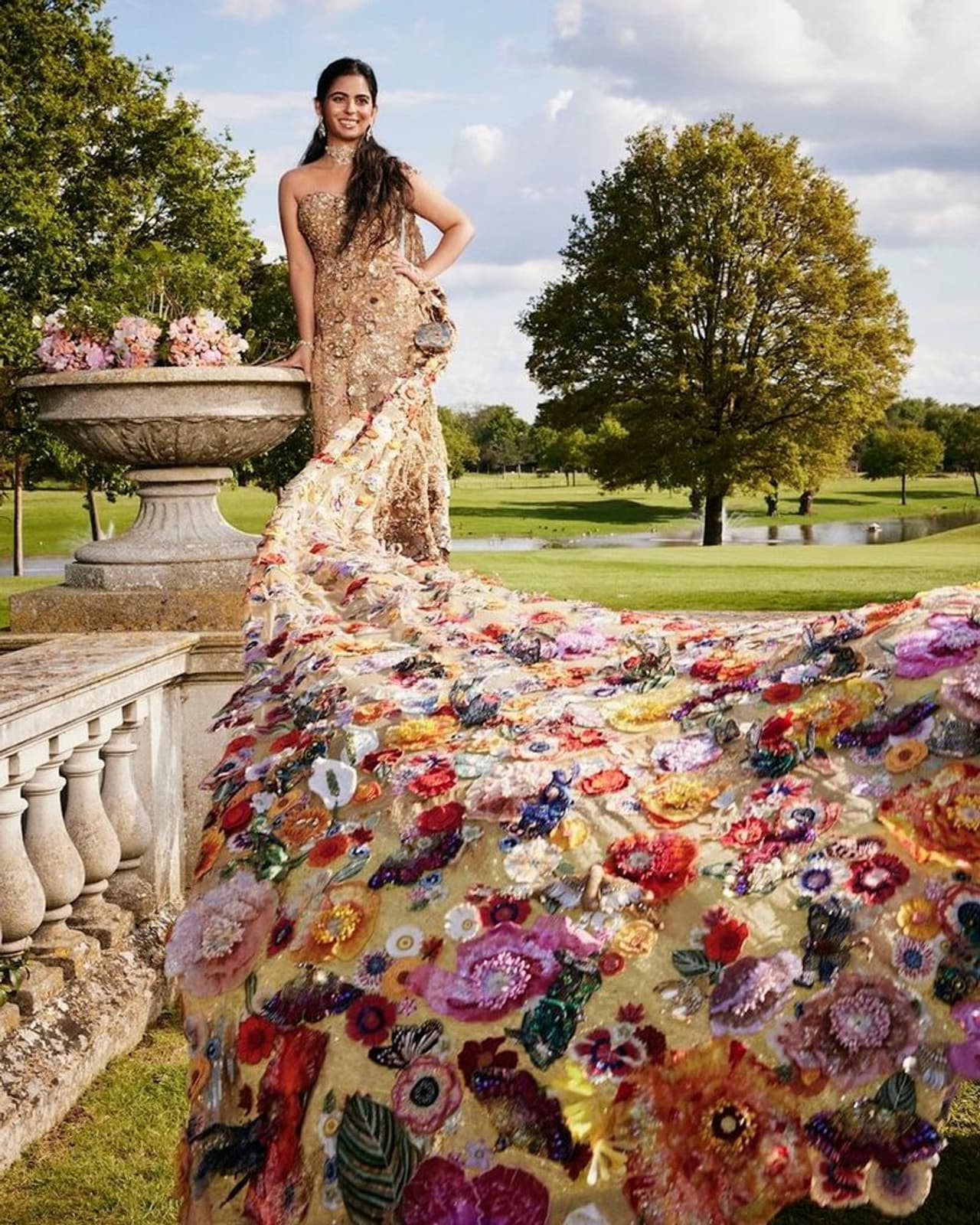 இதில் இந்தியாவை சேர்ந்த பல்வேறு பிரபலங்கள் கலந்துகொண்ட நிலையில் இஷா அம்பானி அணிந்திருந்த புடவை கவுன் அனைவரின் கவனத்தையும் ஈர்த்தது. ராகுல் மிஸ்ராவின் தனிப்பயனாக்கப்பட்ட ரிவர் ஆஃப் லைஃப்' என்று பெயரிடப்பட்ட இந்த நேர்த்தியான ஆடை அனைவரையும் கவர்ந்தது, இந்த புடவை கவுனை தயாரிக்க கிட்டத்தட்ட 10,000 மணிநேரங்களுக்கு மேல் ஆனது.
