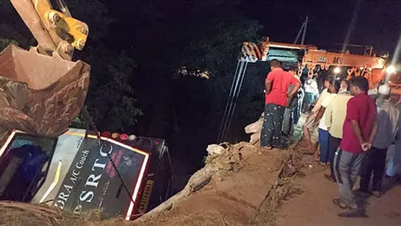 இந்த விபத்து தொடர்பாக போலீசாருக்கும் மீட்பு குழுவினருக்கும் தகவல் தெரிவிக்கப்பட்டது. சம்பவ இடத்திற்கு விரைந்த மீட்பு குழுவினர் கிரேன் உதவியுடன் பேருந்தை மீட்டனர். இந்த விபத்து தொடர்பாக போலீசார் வழக்குப்பதிவு செய்து விசாரணை நடத்தியதில் ஓட்டுநரின் தூக்க கலக்கத்தால் விபத்து நிகழ்ந்ததாக கூறப்படுகிறது.