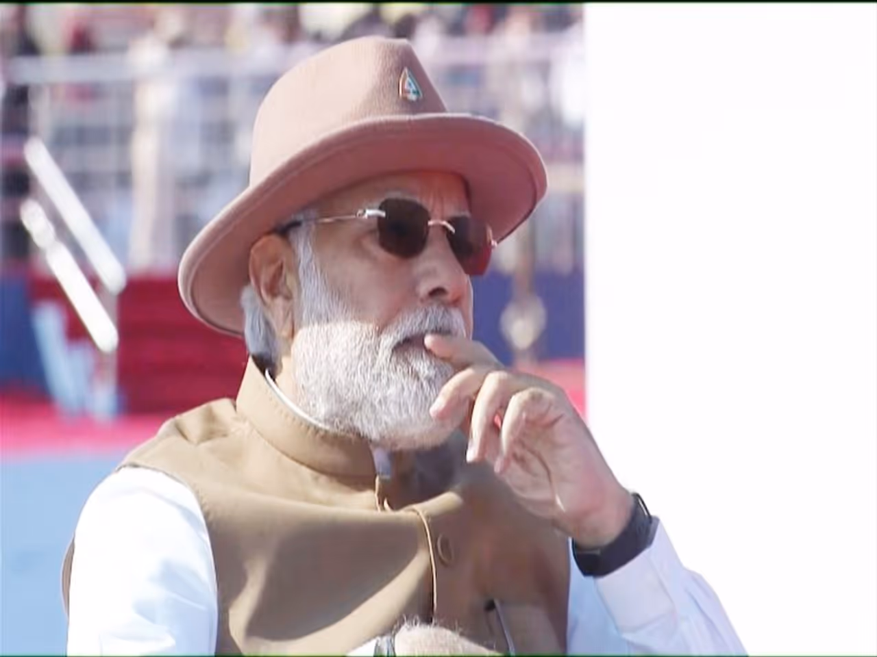 பிரதமர் நரேந்திர மோடி வானில் சாகசத்தில் ஈடுபடும் விமானங்களை நோக்கி கை அசைத்து பாராட்டு தெரிவிக்கிறார்.