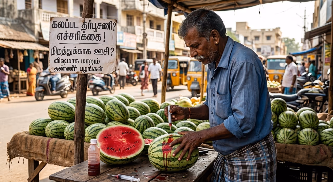 கோடைகாலம் தொடங்கி விட்டாலே தர்பூசணி விற்பனை சூடுபிடிக்கும். அதிக லாபத்திற்காக தர்பூசணிக்கு சாயம் ஏற்றுவது, இனிப்பு சுவையை அதிகரிக்க ஊசிகளை பயன்படுத்துவது என்று அதிர்ச்சி அளிக்கும் விஷயங்கள் நடந்து வருகிறது. மேலும் மும்பையில் தர்பூசணி சாப்பிட்ட ஒரு குடும்பமே பலியாகி உள்ள சம்பவம் நாட்டையே உலுக்கி உள்ளது. இந்த பதிவில் கலப்பட தர்பூசணியை எப்படி கண்டறிவது? அதில் உள்ள ஆபத்துகள் என்ன? என்பது குறித்து விரிவான தகவல்களைப் பார்க்கலாம்.