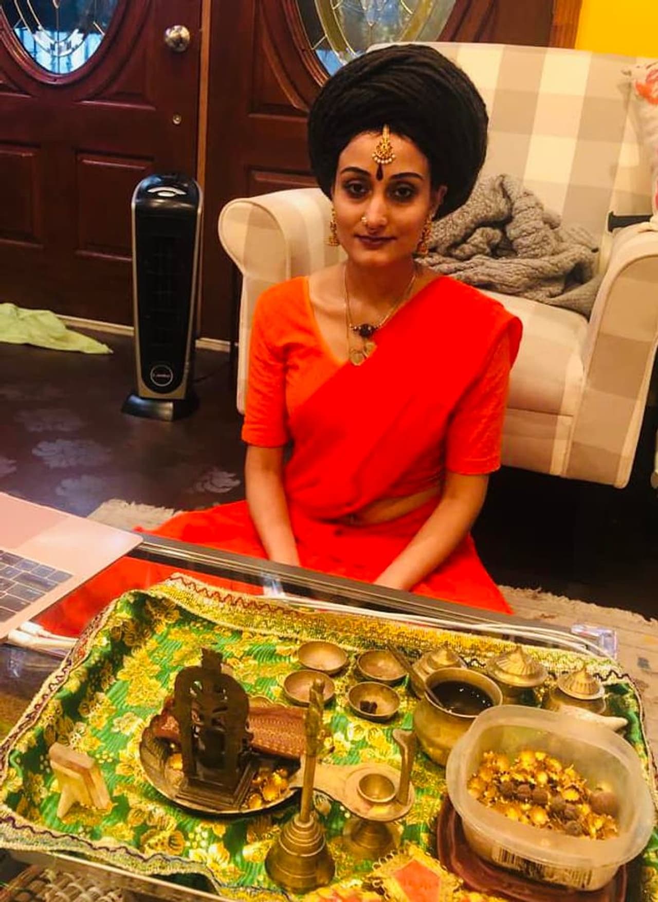 புடவை, ருத்ராட்சம் மற்றும் தங்க ஆபரணங்களை அணிந்திருக்கும் இவர், மாடர்ன் உடைகள் அணிந்த படங்களை பேஸ்புக்கில் பகிர்ந்துள்ளார்.