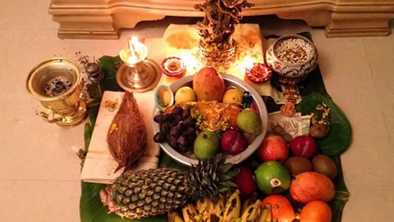 முந்தைய தினத்தின் இரவில் ஒரு தட்டில் முக்கனிகளான மா, பலா, வாழை போன்றவற்றை எடுத்து வையுங்கள். தவறாமல் இவை வழிபாட்டில் வைக்கப்பட வேண்டும். இதனுடன் வேறு பழங்களையும் வைக்கலாம். இவற்றுடன் 1 எலுமிச்சை பழம், வெற்றிலை, பாக்கு போன்றவை வைக்கலாம். வீட்டில் உள்ள தங்க நகைகளில் ஏதேனும் ஒன்றை தட்டில் வைத்தால் கூட போதுமானது. அது ஒரு குண்டுமணி தங்கமாக இருந்தாலும் சரி வைக்க வேண்டும்.