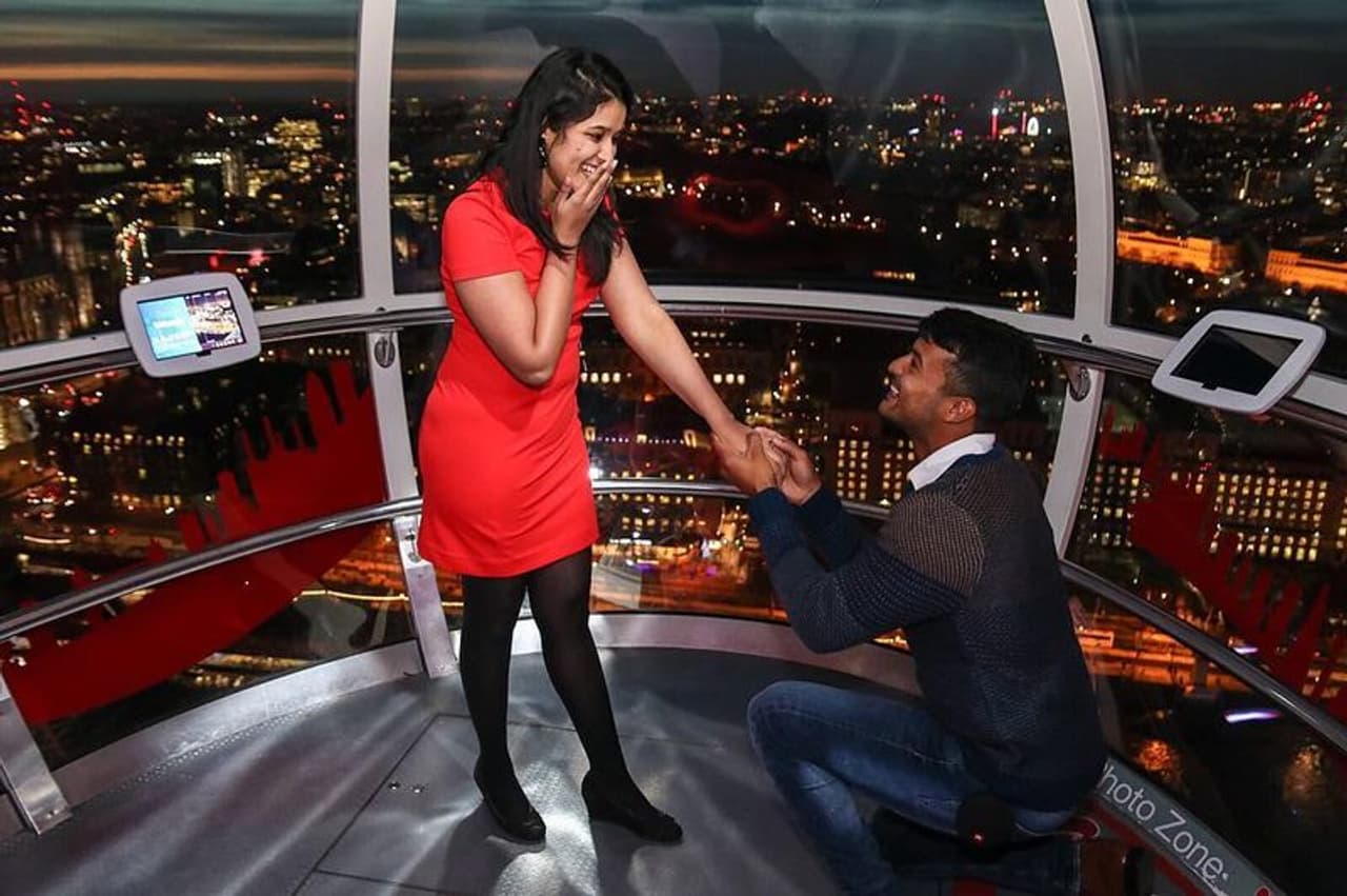<p>2016 ஆம் ஆண்டில், லண்டனில் தேம்ஸ் நதிக்கரையில் பிரமாண்டமான 'மில்லினியம் வீல்' அல்லது 'லண்டன் கண்' கண்' மீது மண்டியிட்டு மாயங்க் அசிதாவுக்கு முன்மொழிந்தார்</p>