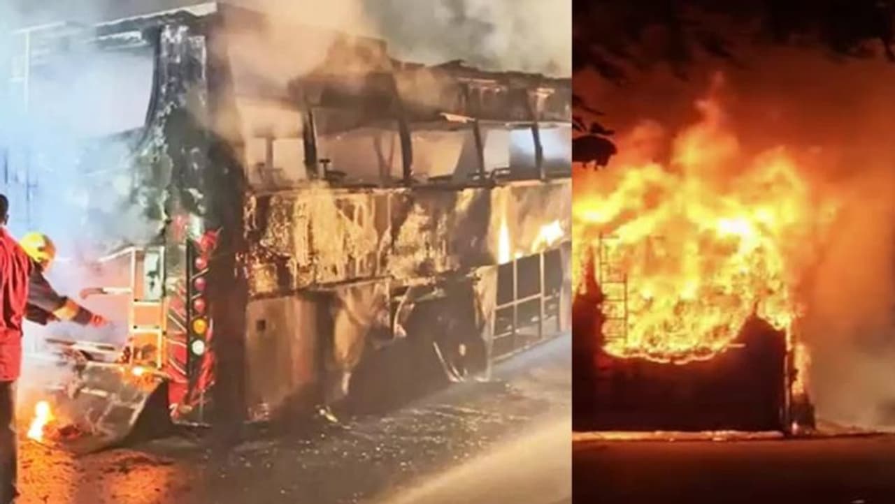 ஆனால், இதை கவனிக்காமல் ஓட்டுநர் தொடர்ந்து பேருந்தை இயக்கினார். அப்போது பின்னால் வந்த மற்ற வாகன ஓட்டிகள் இதை கண்டு அதிர்ச்சியடைந்தனர். அவர்கள் தங்கள் வாகனத்தை வேகமாக இயக்கி பேருந்தை முந்தி சென்று ஓட்டுநரிடம் தீ விபத்து குறித்து தெரிவித்துள்ளார். உடனே ஓட்டுநர் பேருந்தை சாலையோரத்தில் நிறுத்திவிட்டு ஆழ்ந்த தூக்கத்தில் இருந்த மாணவர்களை அலறியபடி ஓட்டுநர் எழுப்பியுள்ளார்.