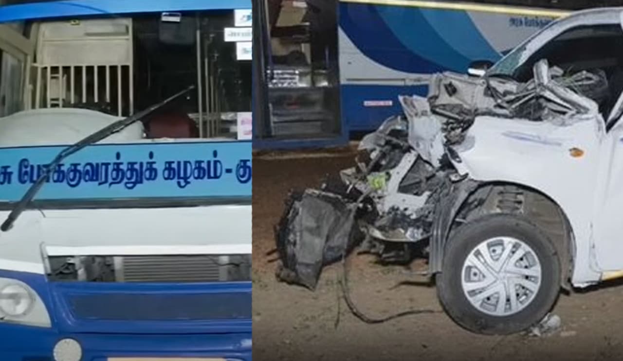 இன்று அதிகாலை திருச்சி மாவட்டம் சிறுநகனூர் தேசிய நெடுஞ்சாலையில் பழுதாகி நின்று கொண்டிருந்த அரசு பேருந்தின் மீது கார் பயங்கரமாக மோதியுள்ளது. இந்த விபத்தில் கார் அப்பளம் போல் நொறுங்கியது. இந்த விபத்தில் காரில் பயணித்த ஒன்றரை வயது குழந்தை அனோனியா, யசோதா, விஜயபாபு ஆகியோர் சம்பவ இடத்திலேயே உடல் நசுங்கி ரத்த வெள்ளத்தில் துடிதுடித்து உயிரிழந்தனர்.
