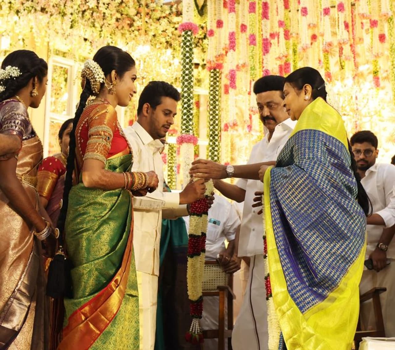 ஸ்டாலின் இல்ல திருமண விழா என்பதால் அமைச்சர் துரைமுருகன் உள்ளிட்ட மூத்த திமுக தலைவர்கள் பலரும் பங்கேற்று மணமக்களை வாழ்த்தினர். மணமகன் கருணாரத்தினம், முதல்வர் மு.க.ஸ்டாலினின் மாமனார் ஜெயராமனின் பேரன் ஆவ