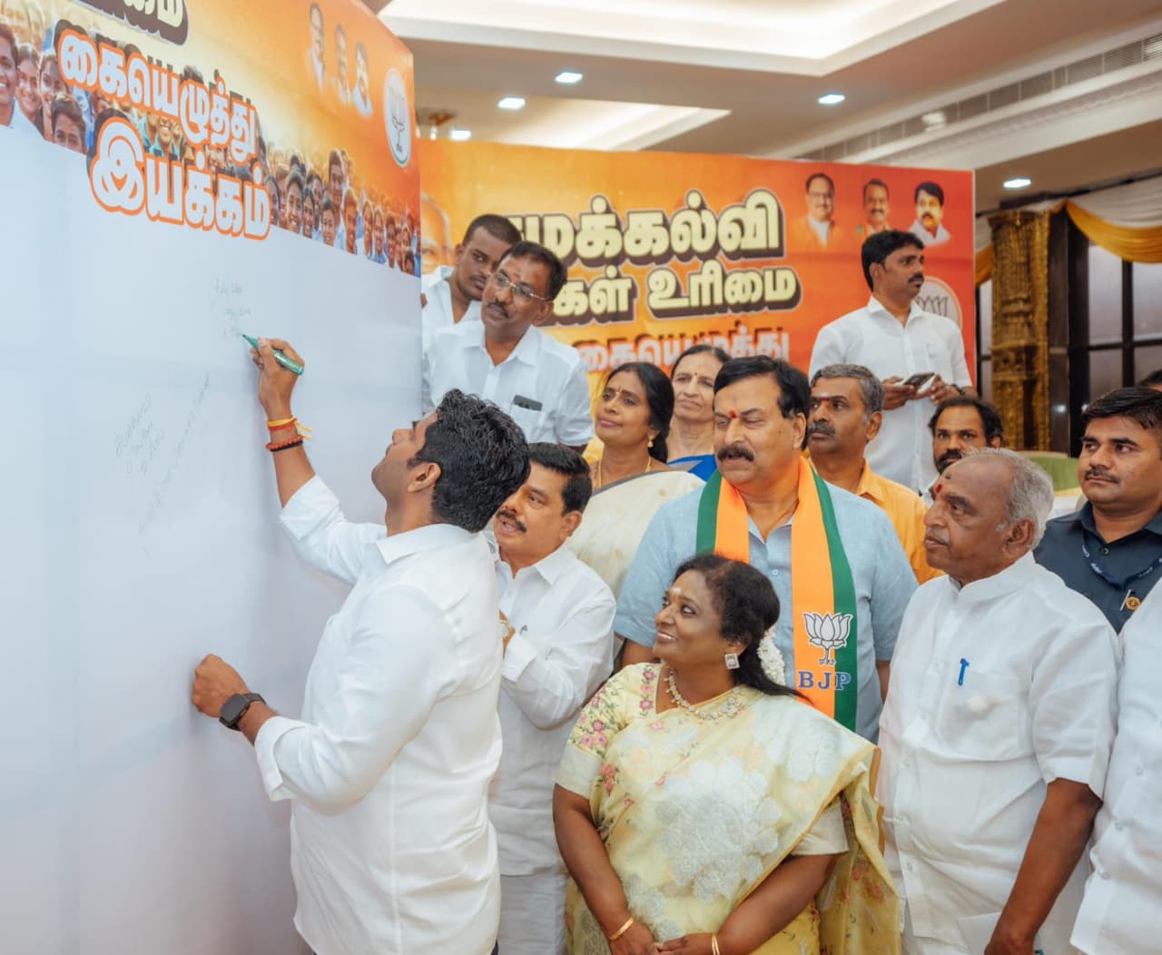 அதன் படி நேற்று முன்தினம், தொடங்கிய கையெழுத்து இயக்கத்தை அந்த அந்த மாவட்டத்தில் பாஜகவினர் பெற்று வருகிறார்கள். அதன் படி பள்ளி மாணவர்கள், மக்கள் கூடும் இடங்களில் கையெழுத்து பெற்று வருகிறார்கள், இந்த சூழ்நிலையில் அதிமுக முன்னாள் எம்எல்ஏ விஜயகுமார் கையெழுத்து இயக்கத்திற்கு ஆதரவு தெரிவித்து கையெழுத்திட்டார்.