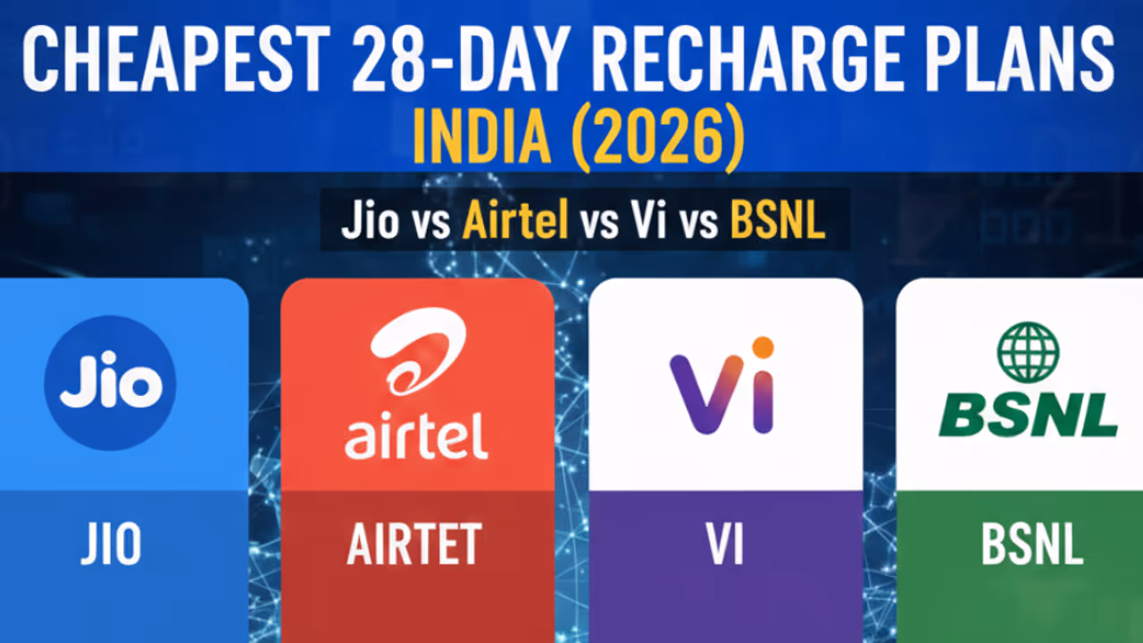 இந்தியாவில் 28 நாட்கள் செல்லுபடியாகும் மலிவான ரீசார்ஜ் திட்டத்தைக் கண்டுபிடிப்பது சவாலானது. ஜியோ, ஏர்டெல், விஐ, மற்றும் பிஎஸ்என்எல் ஆகியவற்றில் சிறந்த திட்டத்தை எவ்வாறு தேர்வு செய்வது என்பதை இந்த கட்டுரை விளக்குகிறது.