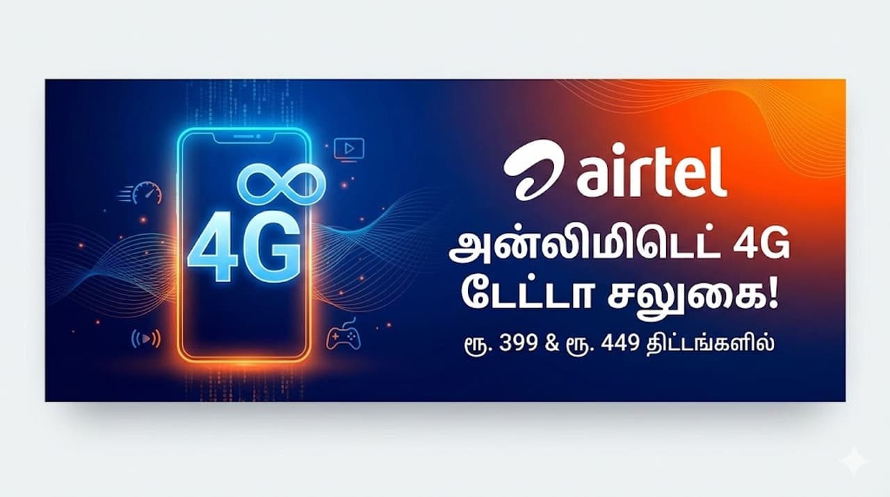 - ஏர்டெல் அதிரடி: இனி டேட்டா தீர்ந்துவிடும் என்ற கவலையே வேண்டாம் - அன்லிமிடெட் 4G ஆஃபர் இதோ!