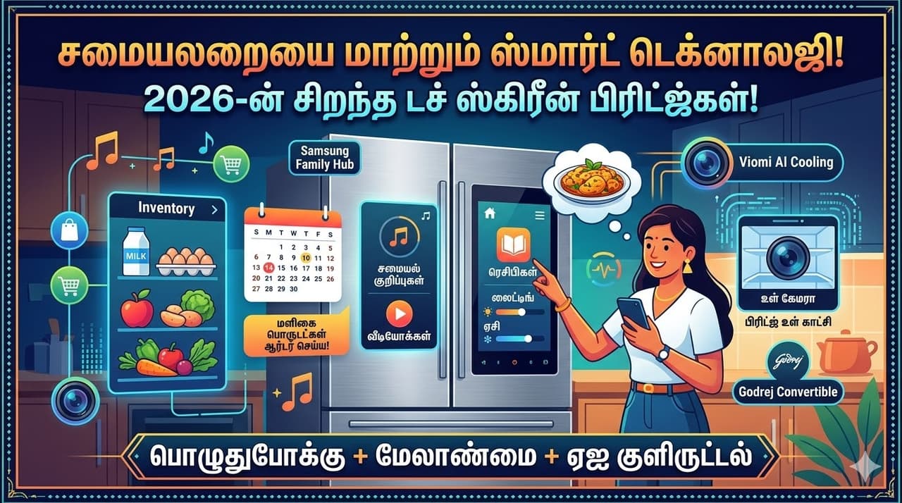 Smart Refrigerators 2026-ன் சிறந்த டச் ஸ்கிரீன் ஸ்மார்ட் பிரிட்ஜ்கள். சாம்சங், வியோமி மற்றும் கோத்ரேஜ் மாடல்களின் சிறப்பம்சங்கள் மற்றும் விலை விவரங்கள்.