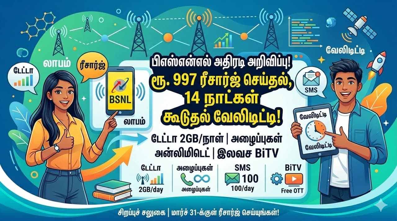 BSNL பிஎஸ்என்எல் வழங்கும் ரூ. 997 ரீசார்ஜ் திட்டத்தில் 14 நாட்கள் கூடுதல் வேலிடிட்டி பெறுங்கள். தினமும் 2GB டேட்டா, அன்லிமிடெட் கால்ஸ் மற்றும் இலவச BiTV சலுகைகள்!