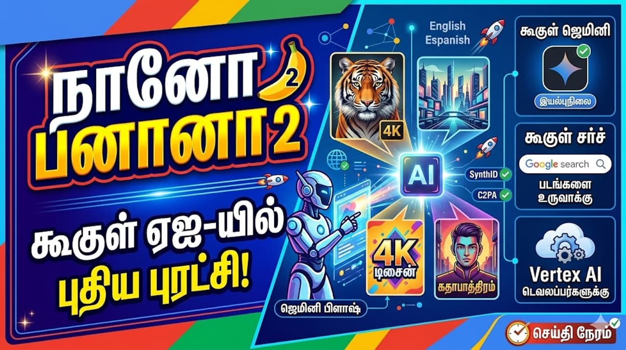 Nano Banana கூகுளின் புதிய 'நானோ பனானா 2' ஏஐ கருவி அறிமுகம். 4K தரம், அதிவேக இமேஜ் ஜெனரேஷன் மற்றும் தமிழ் மொழி ஆதரவு குறித்த விவரங்கள் இங்கே.'நானோ பனானா 2' ஏஐ!