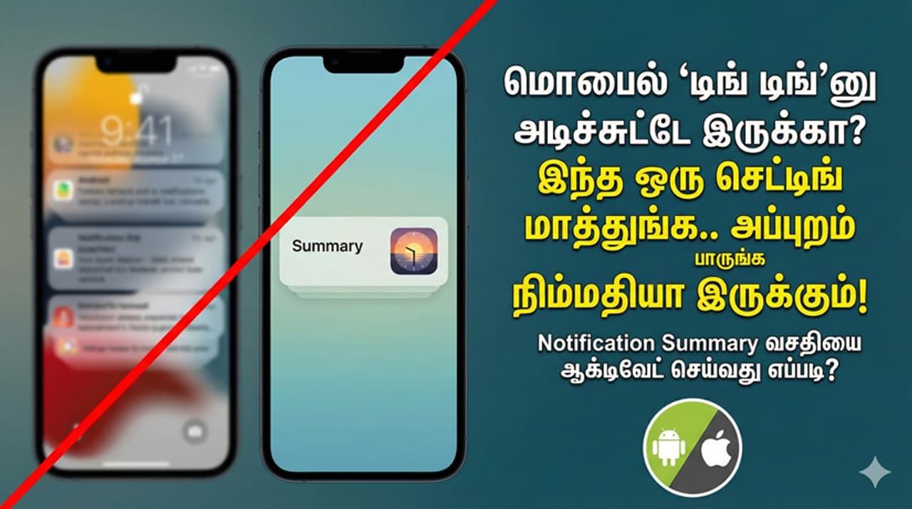 காலையில் எழுந்ததிலிருந்து இரவு தூங்கும் வரை உங்கள் ஸ்மார்ட்போன் இடைவிடாமல் ஒலித்துக்கொண்டே இருக்கிறதா? ஒவ்வொரு முறை 'டிங்' சத்தம் கேட்கும்போதும், வேலையை விட்டுவிட்டு போனைப் பார்க்கிறீர்களா? கவலை வேண்டாம், இந்தப் பிரச்சனையைச் சந்திக்காதவர்களே இல்லை. இதற்காகவே ஆண்ட்ராய்டு மற்றும் ஐபோன்களில் 'நோட்டிஃபிகேஷன் சம்மரி' (Notification Summary) என்றொரு சிறப்பான வசதி உள்ளது. இது தேவையற்ற நோட்டிஃபிகேஷன்களைத் தடுத்து நிறுத்தி, நீங்கள் விரும்பும் நேரத்தில் மொத்தமாக உங்களுக்குக் காட்டும்.