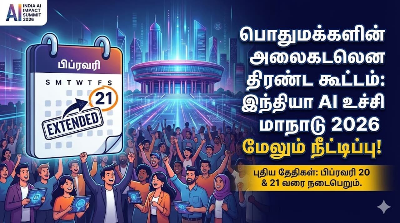 AI Impact Summit மக்கள் அமோக வரவேற்பை அடுத்து இந்தியா AI உச்சி மாநாடு 2026 பிப்ரவரி 21 வரை நீட்டிக்கப்பட்டுள்ளது. புதிய கால அட்டவணை மற்றும் அனுமதி விவரங்களை இங்கே காணுங்கள்.