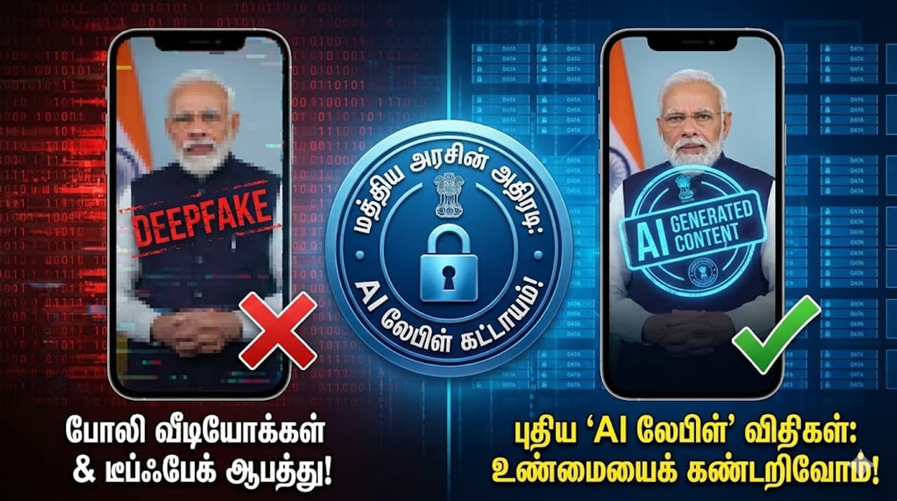 Deepfakes இணையத்தில் பரவும் போலி வீடியோக்கள் மற்றும் டீப்ஃபேக்குகளைத் தடுக்க மத்திய அரசு புதிய விதிகளை இறுதி செய்துள்ளது. இனி AI மூலம் உருவாக்கப்படும் அனைத்து போட்டோ, வீடியோக்களிலும் 'லேபிள்' அல்லது 'வாட்டர்மார்க்' கட்டாயமாகிறது. முழு விவரம் உள்ளே.