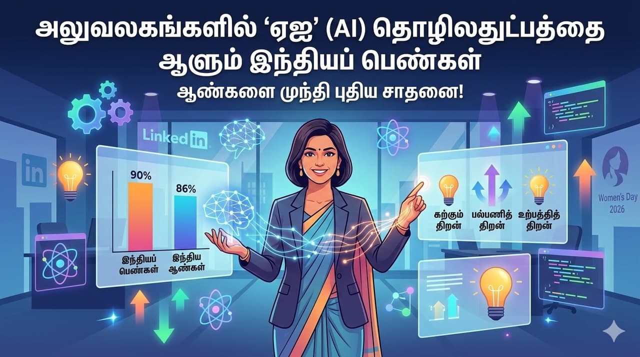 சர்வதேச மகளிர் தினம் 2026 கொண்டாடப்படும் வேளையில், இந்தியப் பெண்கள் தொழில்நுட்பத் துறையில் புதிய மைல்கல்லை எட்டியுள்ளனர். குறிப்பாக, செயற்கை நுண்ணறிவு (AI) தொழில்நுட்பத்தை அலுவலகப் பணிகளில் பயன்படுத்துவதில் ஆண்களை விட இந்தியப் பெண்களே அதிக ஆர்வம் காட்டி முன்னிலையில் உள்ளனர் என்ற ஆச்சரியமான தகவல் வெளியாகியுள்ளது. லிங்க்ட்இன் (LinkedIn) வெளியிட்டுள்ள புதிய தரவுகள் இதை உறுதிப்படுத்துகின்றன.