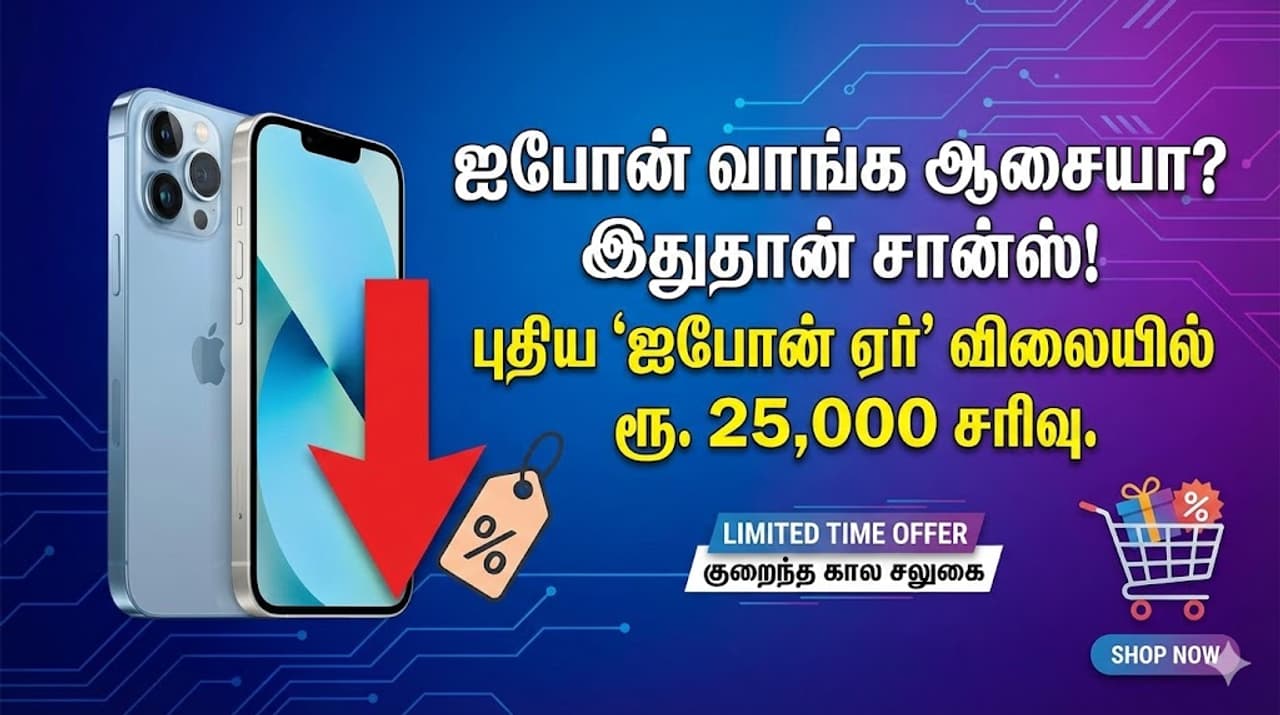 iPhone Air பிளிப்கார்ட் சேலில் ஐபோன் ஏர் (iPhone Air) விலையில் ரூ.25,000 வரை அதிரடி தள்ளுபடி! புதிய விலை, வங்கி சலுகைகள் மற்றும் சிறப்பம்சங்களை இங்கே தெரிந்து கொள்ளுங்கள்.