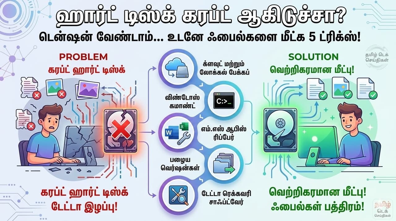 நம்முடைய முக்கியமான புகைப்படங்கள், அலுவலக ஆவணங்கள் அல்லது ப்ராஜெக்ட் ஃபைல்கள் என அனைத்தும் சேமிக்கப்பட்டிருக்கும் ஹார்ட் டிஸ்க் (Hard Drive) திடீரென 'கரப்ட்' (Corrupt) ஆகிவிட்டால், உலகமே இருண்டுவிட்டதைப் போலத் தோன்றும். பவர் கட் (Power failure), ஹார்டுவேர் கோளாறுகள் அல்லது சாஃப்ட்வேர் பிரச்னைகளால் இப்படி ஃபைல்கள் ஓபன் ஆகாமல் போகலாம். ஆனால், இதற்காகப் பயப்படத் தேவையில்லை. எவ்வித முன்அனுபவமும், தொழில்நுட்ப அறிவும் இல்லாமல் உங்கள் ஃபைல்களை நீங்களே எளிதாக மீட்க முடியும். அதற்கான 5 நிரூபிக்கப்பட்ட வழிகளை இங்கே பார்ப்போம்.