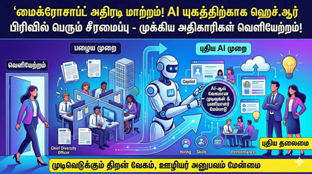 உலகின் முன்னணி தொழில்நுட்ப நிறுவனமான மைக்ரோசாப்ட், தனது மனிதவள மேம்பாட்டு (HR) பிரிவில் மிகப் பெரிய மாற்றங்களை அறிவித்துள்ளது. சுமார் 2,20,000 ஊழியர்களை நிர்வகிக்கும் இந்த பிரிவை, தற்போதைய செயற்கை நுண்ணறிவு (AI) தொழில்நுட்ப வளர்ச்சிக்கு ஏற்ப மாற்றியமைக்க அந்நிறுவனம் முடிவு செய்துள்ளது. இது குறித்த அறிவிப்பை மைக்ரோசாப்ட் நிறுவனத்தின் தலைமை மக்கள் அதிகாரி (Chief People Officer) ஏமி கோல்மேன் அதிகாரப்பூர்வமாக வெளியிட்டுள்ளார்.