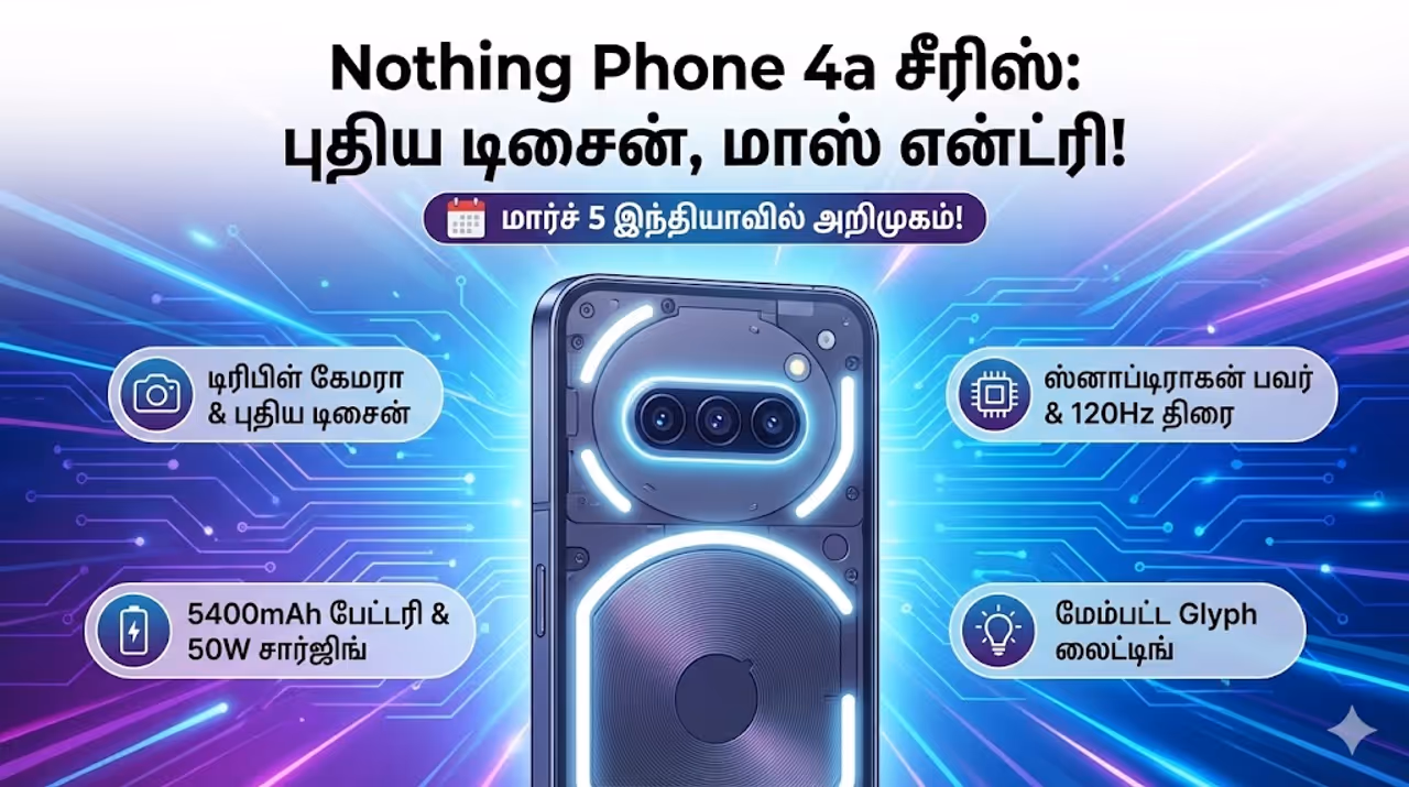 Nothing Phone 4a நத்திங் போன் 4a சீரிஸ் மார்ச் 5 ஆம் தேதி இந்தியாவில் வெளியாகிறது. இதன் பிரத்தியேக டிசைன், ப்ராசஸர் மற்றும் பேட்டரி விவரங்களை இங்கே முழுமையாக தெரிந்துகொள்ளுங்கள்.