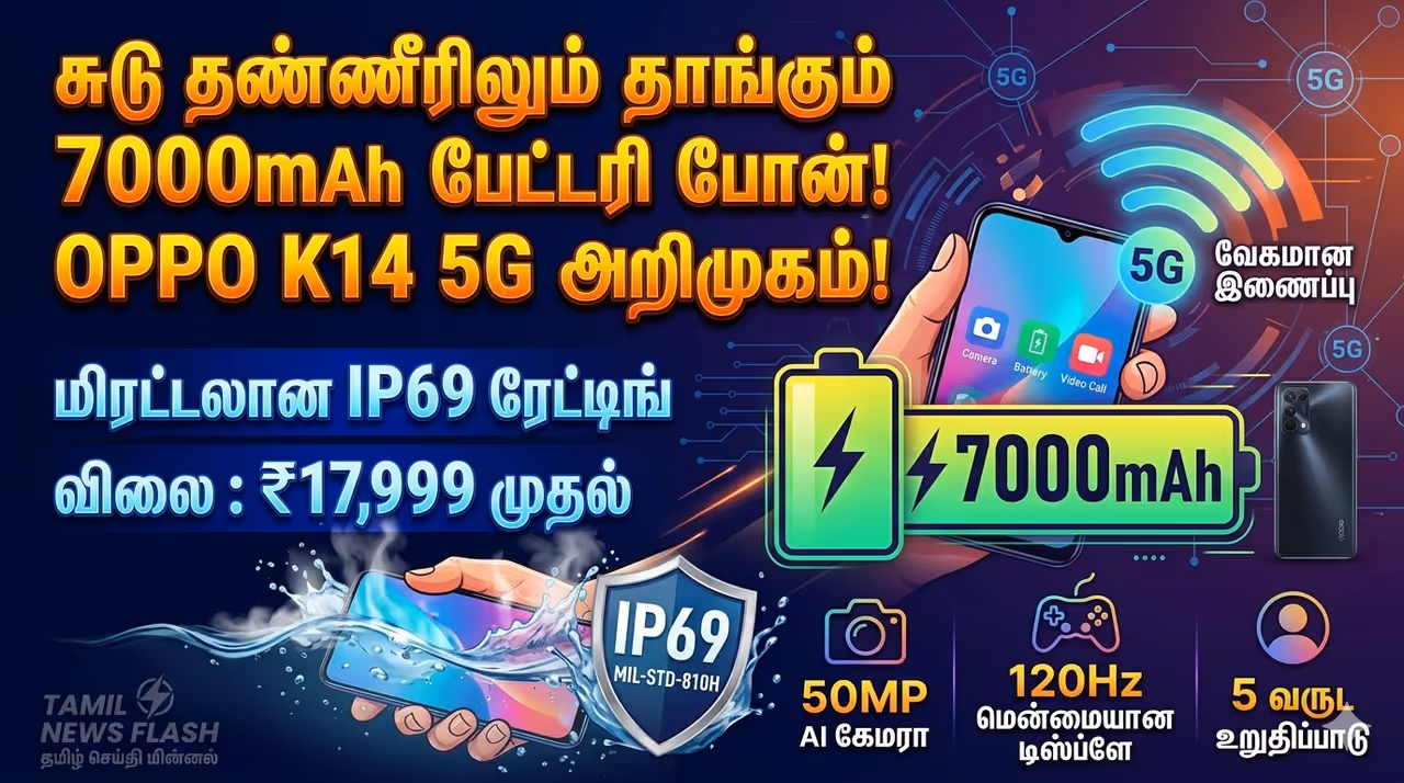 Oppo K14 ஓப்போ K14 5G இந்தியாவில் அறிமுகம்! 7000mAh பேட்டரி, IP69 பாதுகாப்பு மற்றும் அதிரடி விலை. முழு விவரங்கள் இதோ. மிரட்டலான IP69 பாதுகாப்புடன் புதிய ஓப்போ போன் அறிமுகம்!