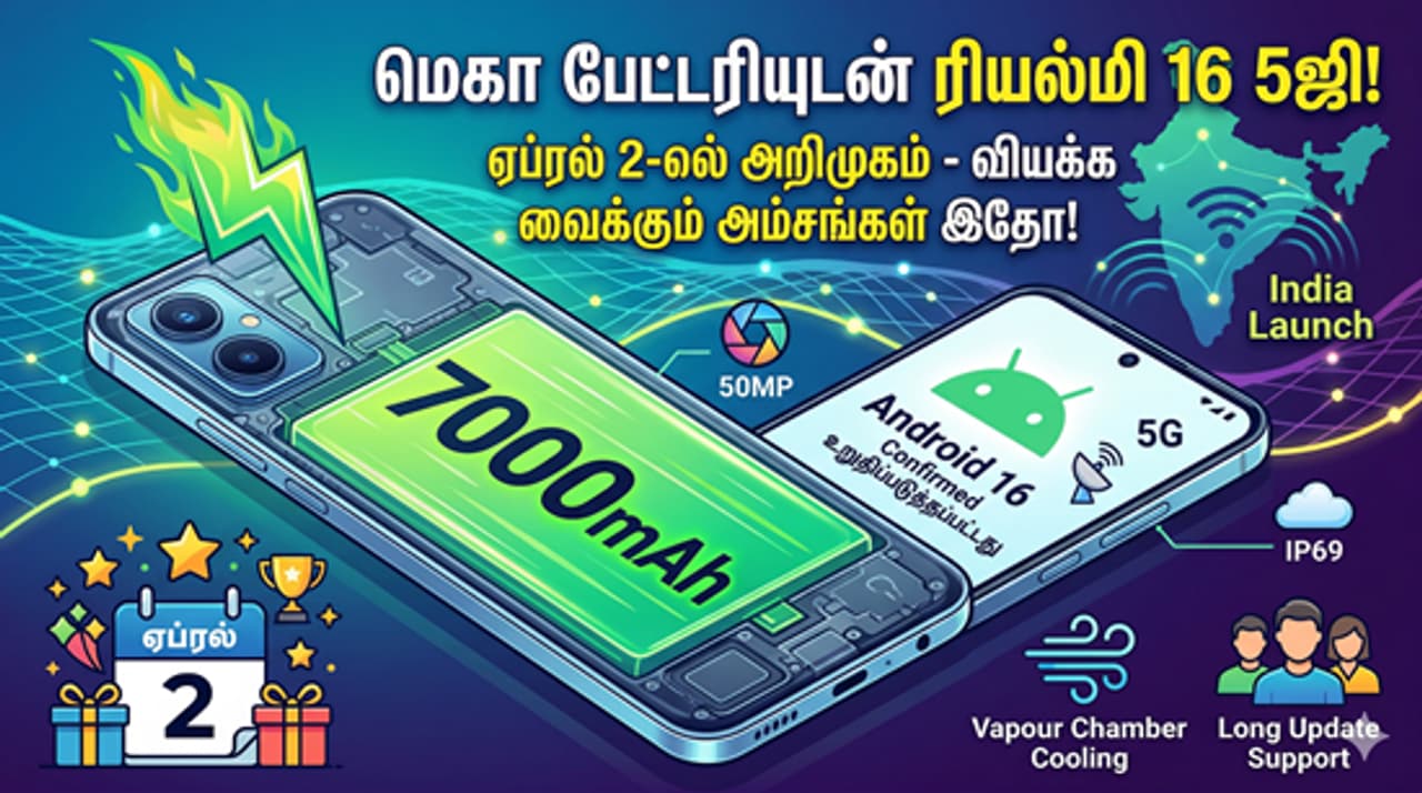 Realme 16 5G ரியல்மி 16 5ஜி ஏப்ரல் 2-ல் அறிமுகம். 7000mAh பேட்டரி மற்றும் ஆண்ட்ராய்டு 16 போன்ற அதிரடி அம்சங்கள் இதில் உள்ளன. ரியல்மி 16 5ஜி-யில் இருக்கும் அந்த 'செல்ஃபி மிரர்' ரகசியம் என்ன?