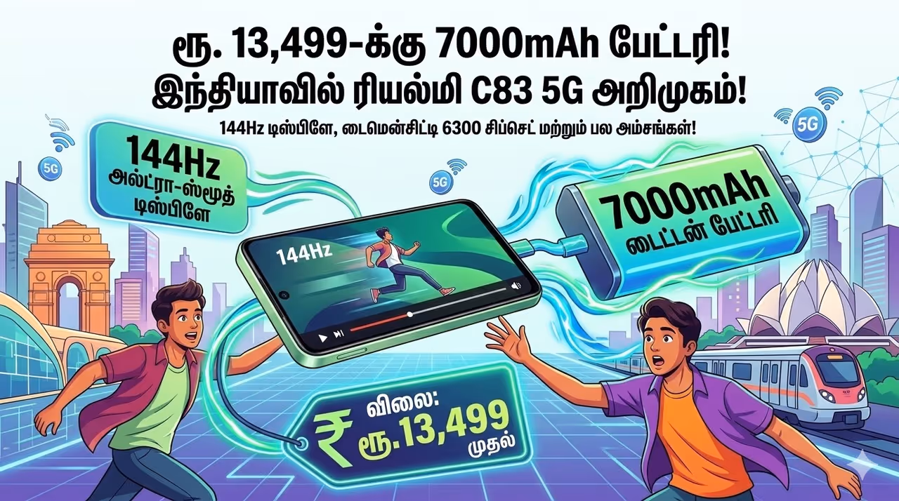 Realme C83 7000mAh பேட்டரி, 144Hz டிஸ்பிளே என அட்டகாசமான அம்சங்களுடன் ரியல்மி C83 5G இந்தியாவில் அறிமுகம். இதன் விலை மற்றும் விற்பனை விவரங்களை இங்கே அறியவும்.
