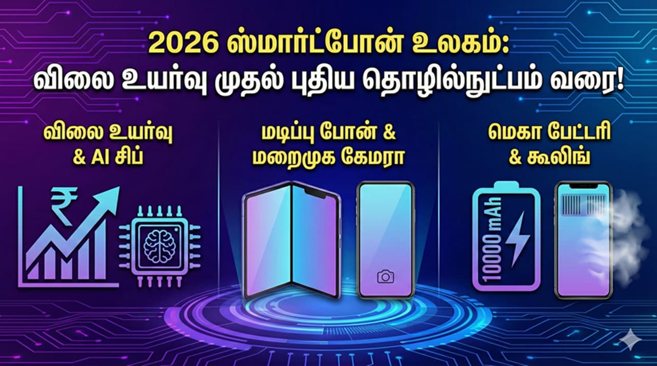 Smartphones 2026-ல் ஸ்மார்ட்போன்களின் விலை உயர்வு, மேம்பட்ட AI வசதிகள் மற்றும் மடிக்கக்கூடிய போன்கள் எனப் பல மாற்றங்கள் வரவுள்ளன. முழு விவரம் இதோ.
