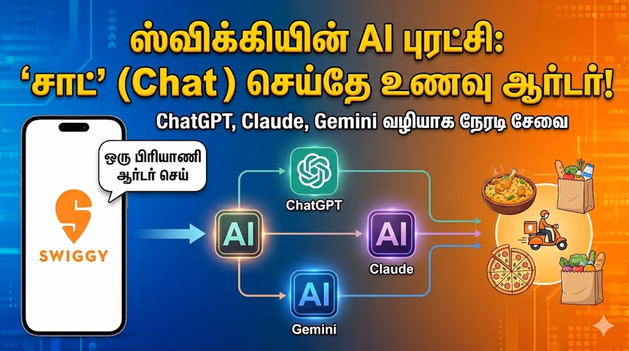 Swiggy ஸ்விக்கி இப்போது ChatGPT, Claude மற்றும் Gemini மூலம் நேரடியாக உணவு மற்றும் மளிகைப் பொருட்களை ஆர்டர் செய்யும் புதிய AI வசதியை அறிமுகப்படுத்தியுள்ளது.