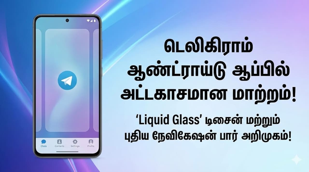 Telegram டெலிகிராம் ஆண்ட்ராய்டு ஆப்பில் புதிய 'Liquid Glass' டிசைன் மற்றும் பாட்டம் நேவிகேஷன் பார் அறிமுகம். இந்த அப்டேட் பற்றிய முழு விவரங்களை இங்கே படியுங்கள்.