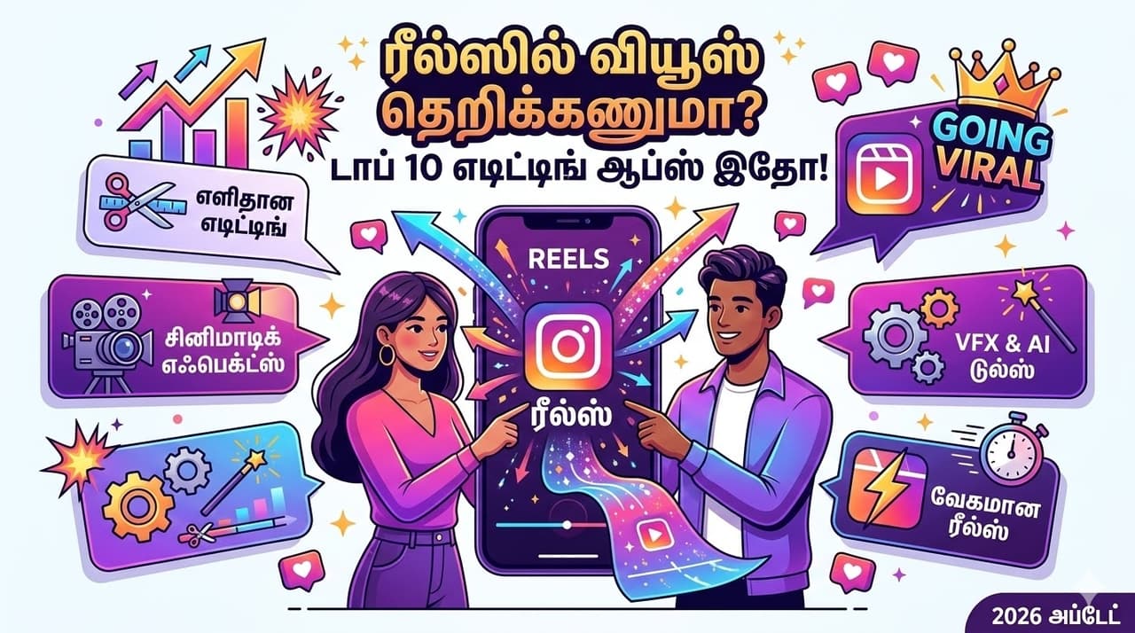 Instagram Reel Editing 2026ல் வைரலாகும் இன்ஸ்டாகிராம் ரீல்ஸ்களை உருவாக்க உதவும் டாப் 10 மொபைல் எடிட்டிங் செயலிகள். முழுமையான அம்சங்களை இங்கே தெரிந்துகொள்ளுங்கள்.