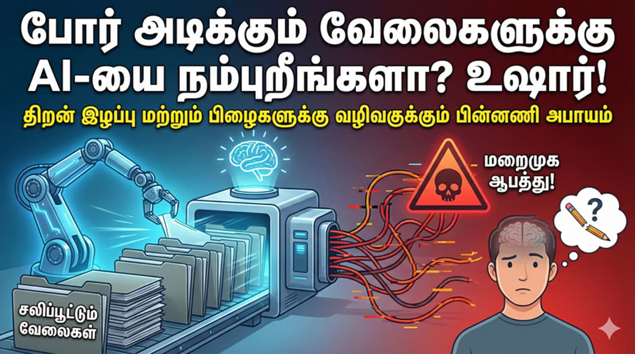 AI சலிப்பூட்டும் வேலைகளுக்கு AI-யை பயன்படுத்துவது வேகத்தை அளித்தாலும், அது திறமை இழப்பு மற்றும் பிழைகளுக்கு வழிவகுக்கும். இதன் மறைமுக பாதிப்புகள் பற்றி இங்கே படியுங்கள்.