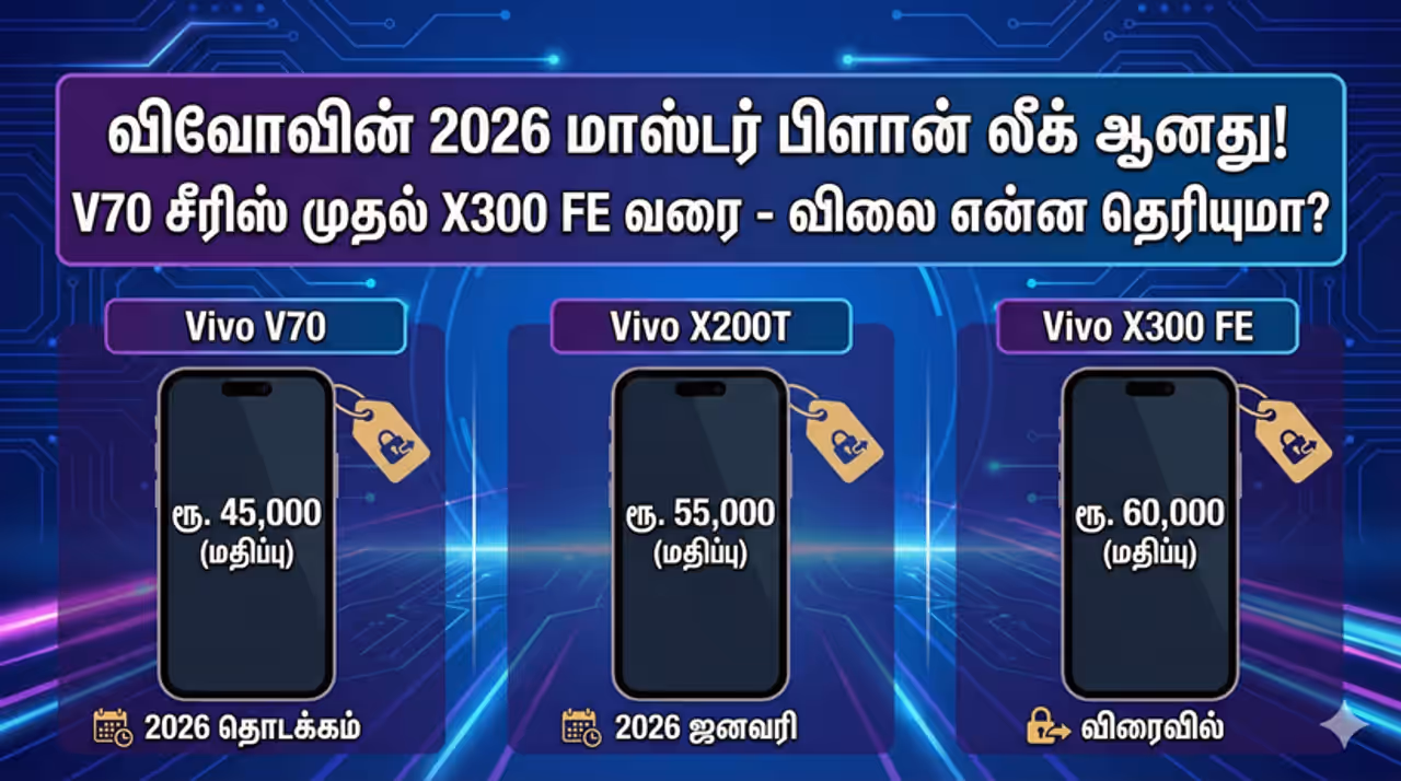 Vivo விவோ நிறுவனம் 2026-ல் V70 சீரிஸ், X200T, X300 FE போன்களை இந்தியாவில் அறிமுகம் செய்யவுள்ளது. விலை மற்றும் விபரங்களை இங்கே காணுங்கள்.