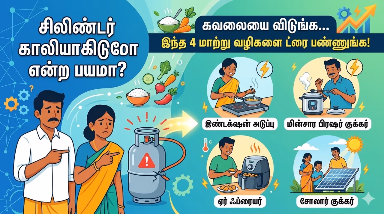 இந்தியாவில் சமையலுக்கு முக்கிய எரிபொருளாக எல்பிஜி சிலிண்டர்கள் இருந்தாலும், தற்போதைய தொழில்நுட்ப வளர்ச்சியில் இதற்கு இணையான, சொல்லப்போனால் இதைவிட பாதுகாப்பான மற்றும் வேகமான பல மாற்று வழிகள் நம்மிடையே உள்ளன. கேஸ் சிலிண்டர் தட்டுப்பாட்டை நினைத்து இனி கவலைப்படத் தேவையில்லை. இதோ உங்களுக்கான 4 சிறந்த மாற்று வழிகள்!