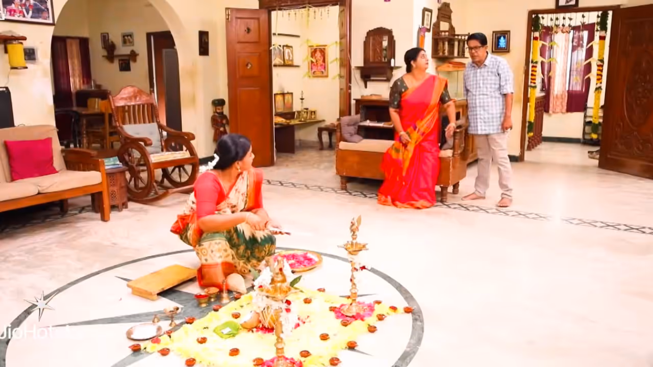 அந்தப் பூஜையில் தான் மிகப்பெரிய ட்விஸ்ட்டே காத்திருக்கிறது. வீட்டில் பூஜை செய்வதற்கான ஏற்பாடுகளை எல்லாம் மீனா செய்து முடிக்க, அங்கே ஒரு பெண் பூஜை செய்ய வருகிறார். பூஜையின் போது சாமி வந்தது போல் ஆடி அந்த பெண் விஜயாவிடம் உன் குடும்பத்தையே ஆட்டிப்படைப்பது போல் பெரிய கெடுதல் நடக்கப் போகிறது என சொல்கிறார். அது மட்டும் இன்றி இந்த வீட்டிற்கு நல்ல நேரம் வர வேண்டும் என்றால் உன்னுடைய இரண்டாவது மருமகள் இந்த வீட்டில் இருக்கக் கூடாது. அதையும் மீறி அவர் இந்த வீட்டில் இருந்தால் உன்னுடைய புருஷன் உயிருக்கு ஆபத்து என அந்த பெண் சாமியார் சொன்னதைக் கேட்டு விஜயா அதிர்ச்சி அடைகிறார்.