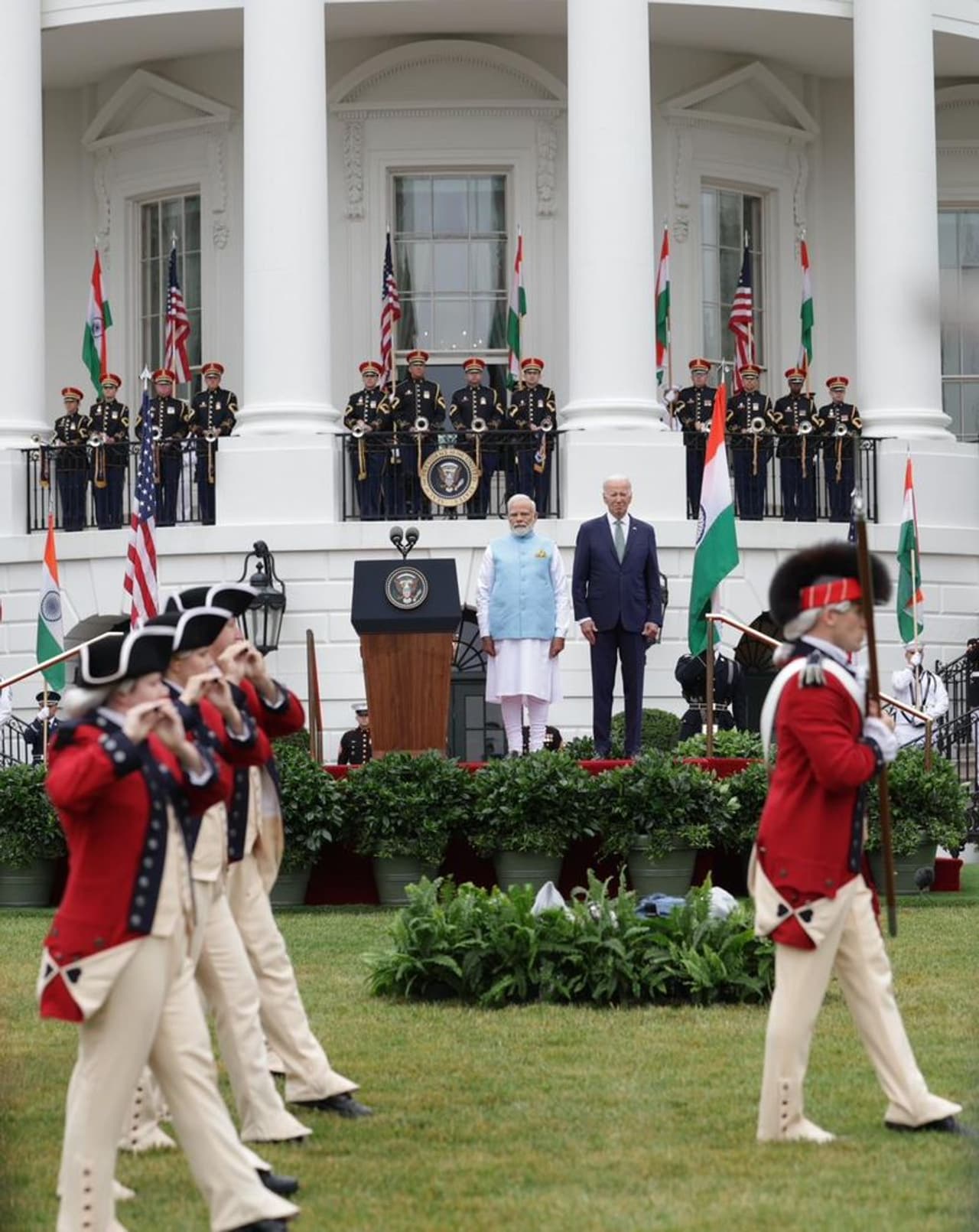 வெள்ளை மாளிகையின் தெற்கு புல்வெளியில் பிரதமர் மோடிக்கு 19 துப்பாக்கி குண்டுகள் முழங்க வரவேற்பு அளிக்கப்பட்டது. இரு நாடுகளின் தேசிய கீதங்கள் இசைக்கப்பட்டது.