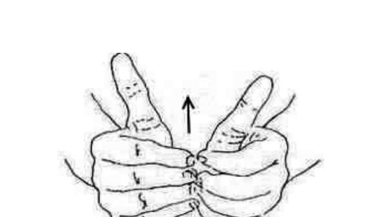 * இரண்டு கை விரல்களையும் மடித்து, விரல் நகங்கள் ஒன்றோடொன்று தொட்டுக் கொள்ளுமாறு வைத்துக் கொள்ள வேண்டும்.