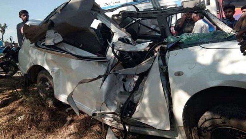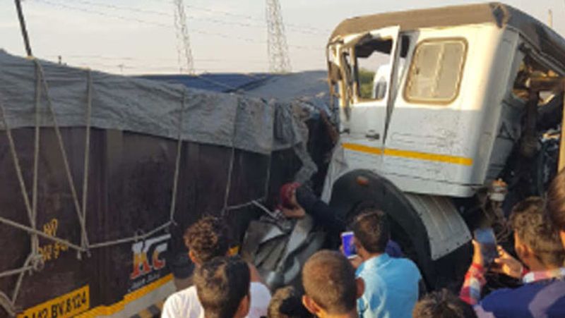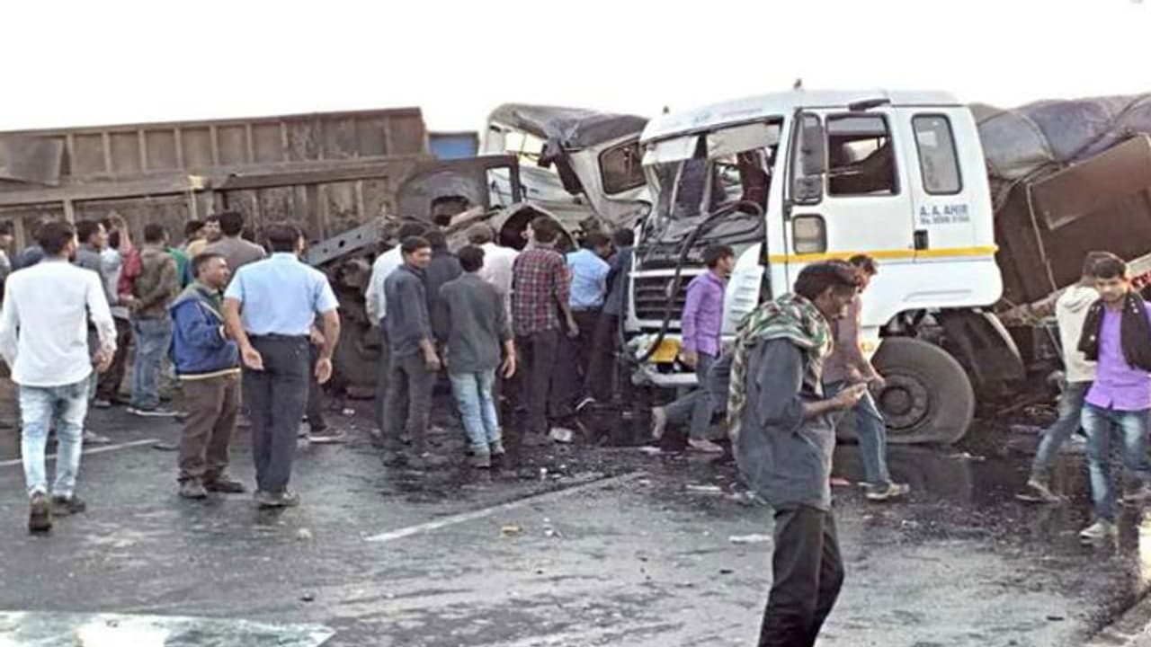 குஜராத் மாநிலம் கட்ச் மாவட்டத்தில் உள்ள பச்சாவ் நெடுஞ்சாலையில் 11 பேர் காரில் புஜ் நோக்கி பயணித்தனர். அப்போது உப்பு ஏற்றிக் கொண்டு எதிர்திசை சாலையில் பயணித்த டிரக் ஒன்று திடீரென சாலையின் தடுப்பை உடைத்துக் கொண்டு வந்து காரின் முன்பக்கமாக அதிவேகத்தில் மோதியது. கண் இமைக்கும் நொடியில், அந்த காரின் பின்னால் வந்த மற்றொரு டிரக்கும் கார் மீது பயங்கரமாக மோதியது.