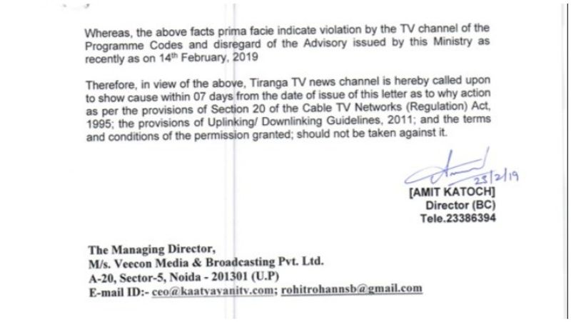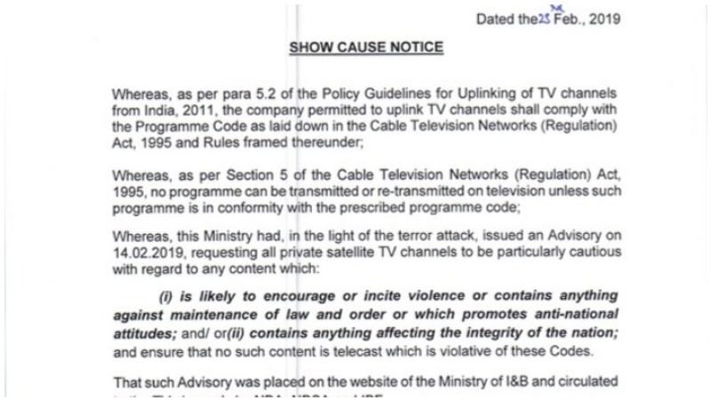 ஆகிய தொலைக்காட்சிகள் ஒளிபரப்பிய செய்தியில் பாகிஸ்தான் செய்தி தொடர்பாளர் மேஜர் ஜெனரல் ஆசிஃப் ஹாஃபூர் பேசிய காட்சிகளையும் இணைத்து அந்த நோட்டிஸுடன் அனுப்பி உள்ளது. அந்தச் செய்திகள், வன்முறையையை தூண்டும் விதமாகவும், உள்ளடக்கத்தில் சட்டம் ஒழுங்கு விதிகளுக்கு எதிராக உள்ளதாகவும், இந்திய இறையாண்மைக்கு எதிராக இருப்பதாகவும், நாட்டின் ஒற்றுமையை சீர்குழைப்பதாக உள்ளதகவும் குற்றம்சாட்டப்பட்டுள்ளது.