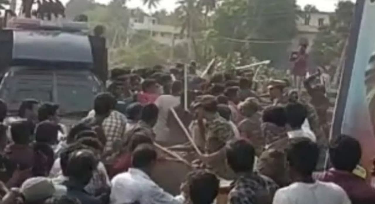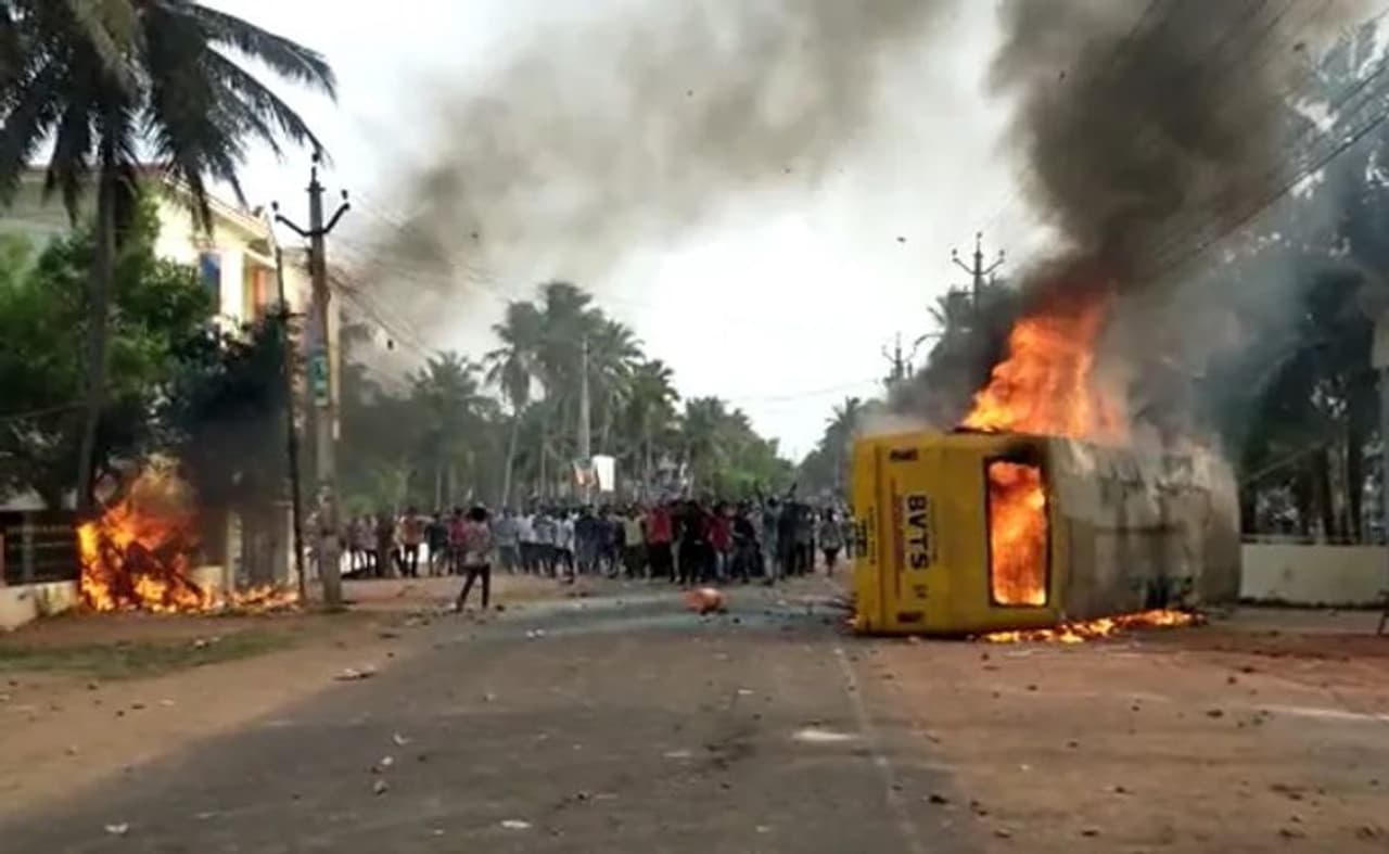 பேரணியை போலீசார் தடுத்ததால் கலவரம் ஏற்பட்டது. இதனால் போலீசார் தடியடி நடத்தினர். ஆத்திரமடைந்த சிலர், எஸ்பி வாகனம் மற்றும் பஸ்கள் மீது கற்களை வீசினர். இதில் எஸ்பியின் பாதுகாவலர் காயமடைந்தார். பல வாகனங்களின் கண்ணாடிகள் உடைக்கப்பட்டது. போராட்டத்தை கட்டுப்படுத்த எஸ்பி சுப்பா தடியடி நடத்த உத்தரவிட்டார். இதையடுத்து கலவரத்தில் ஈடுபட்டவர்களை போலீசார் கைது செய்து தனியார் கல்லூரி பேருந்தில் ஏற்றினர். இதற்கு எதிர்ப்பு தெரிவித்து போராட்டக்காரர்கள், அந்த பேருந்தை தீ வைத்து கொளுத்தினர். மேலும், நீர்பாசனத்துறை அமைச்சர் விஸ்வரூப் முகாம் அலுவலகம், அமலாபுரம் எம்எல்ஏ சதீஷின் வீடு ஆகியவற்றை சூறையாடி தீ வைத்து கொளுத்தினர். மேலும் பல்வேறு வாகனங்களை எரித்தனர்.