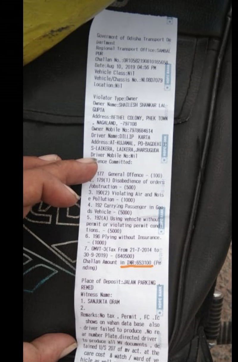 ஒடிசா மாநிலம் சம்பல்பூர் மண்டல போக்குவரத்து அலுவல அதிகாரிகள்தான் இந்த அபராதம் விதித்துள்ளார்கள். இதுகுறித்து சம்பல்பூர் மண்டல போக்குவரத்து அதிகாரி லலித் மோகன் பெஹ்ரா கூறுகையில், “ கடந்த ஆகஸ்ட் 10-ம் தேதி வாகனச் சோதனையில் ஈடுபட்டு இருந்தோம். அப்போது நாகாலாந்து பதிவெண் கொண்ட ஒரு லாரி வந்தது. அதை மறித்துசோதனை செய்தோம்.
