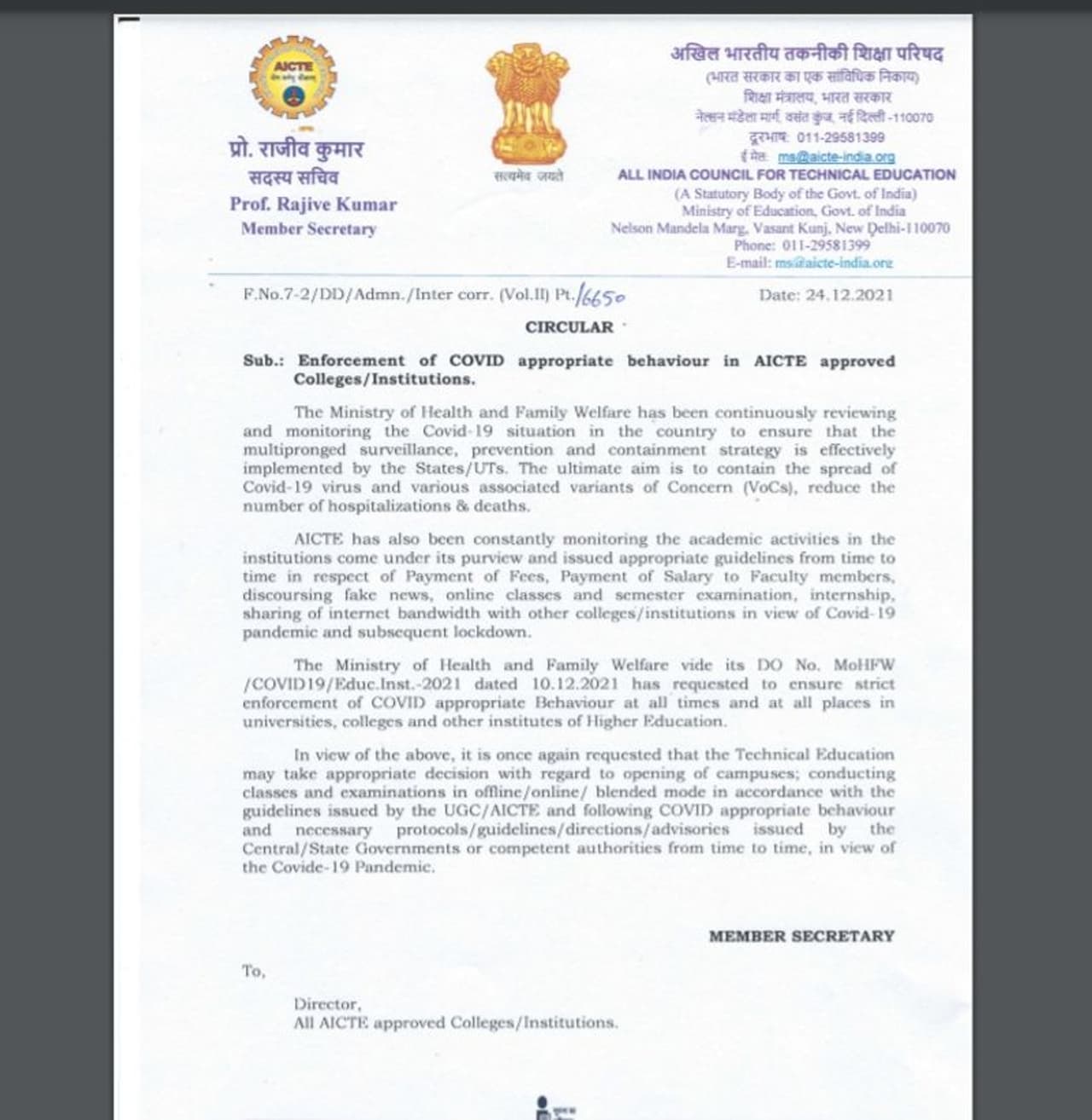 இந்த சூழலில் மத்திய சுகாதாரத்துறை அமைச்சகம் உயர் கல்வி நிறுவனங்களான பல்கலைக்கழகங்கள், கல்லூரிகளில் அனைத்து நேரங்களிலும் கடுமையான கொரோனா பாதுகாப்பு நெறிமுறைகள் கடைப்பிடிக்கப்பட வேண்டும் என்று வலியுறுத்தியுள்ளது. இவை அனைத்தையும் கருத்தில் கொண்டு, யுஜிசி மற்றும் ஏஐசிடிஇ ஆகியவற்றின் வழிமுறைகளைப் பின்பற்றி தொழில்நுட்பக் கல்வி நிறுவனங்கள் தங்களின் வளாகங்களைத் திறப்பது, தேர்வுகள் மற்றும் வகுப்புகளை ஆப்லைன் அல்லது ஆன்லைன் அல்லது இரண்டு வகையிலும் நடத்திக் கொள்வது குறித்து முடிவெடுக்க வேண்டும் என்று அறிவுறுத்தப்படுகிறது.