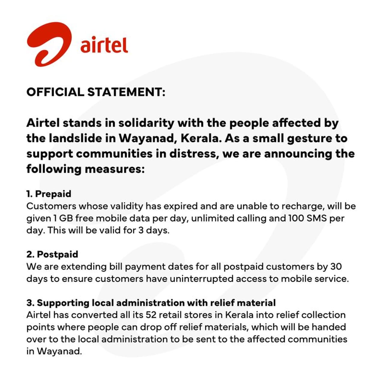 கேரளாவின் வயநாடு பகுதியில் பயங்கர நிலச்சரிவு ஏற்பட்டுள்ளதையடுத்து, பலரும் கேரள மக்களுக்கு உதவிக்கரம் நீட்ட துவங்கியுள்ளனர். ஏற்கனவே கோலிவுட் மற்றும் மோலிவுட் திரையுலக நடிகர்கள், பெரும் தொகையை நிவாரண நிதியாக அளித்து வருகின்றனர். இந்நிலையில் பிரபல தொலைத்தொடர்பு நிறுவனமான பார்தி ஏர்டெல் ஒரு அறிவிப்பை வெளியிட்டுள்ளது.