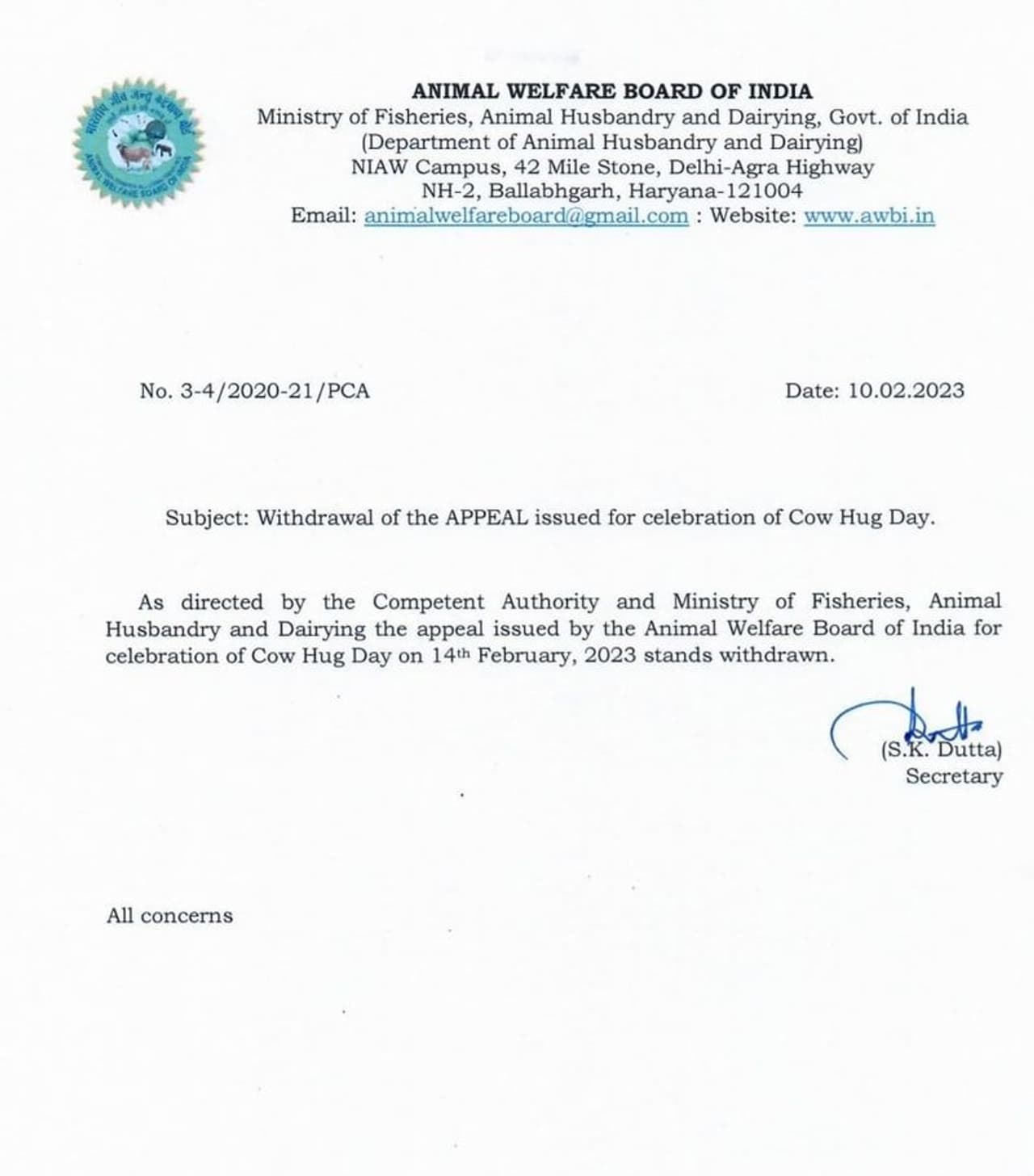 இதனிடையே மத்திய அரசின் அறிவுறுத்தலின் படி பிப்.14 ஆம் தேதியை பசு அணைப்பு தினமாக கடைப்பிடிக்க வேண்டும் என்ற அறிவிப்பை இந்திய விலங்குகள் நல வாரியம் திரும்பப்பெற்றுள்ளது. இதுக்குறித்து இந்திய விலங்குகள் நல வாரியம் வெளியிடப்பட்ட அறிக்கையில், கால்நடைத்துறை அமைச்சகத்தின் அறிவுறுத்தலை அடுத்து பசு அணைப்பு தின அறிவிப்பை திரும்பப் பெறுகிறோம் என்று தெரிவிக்கப்பட்டுள்ளது.