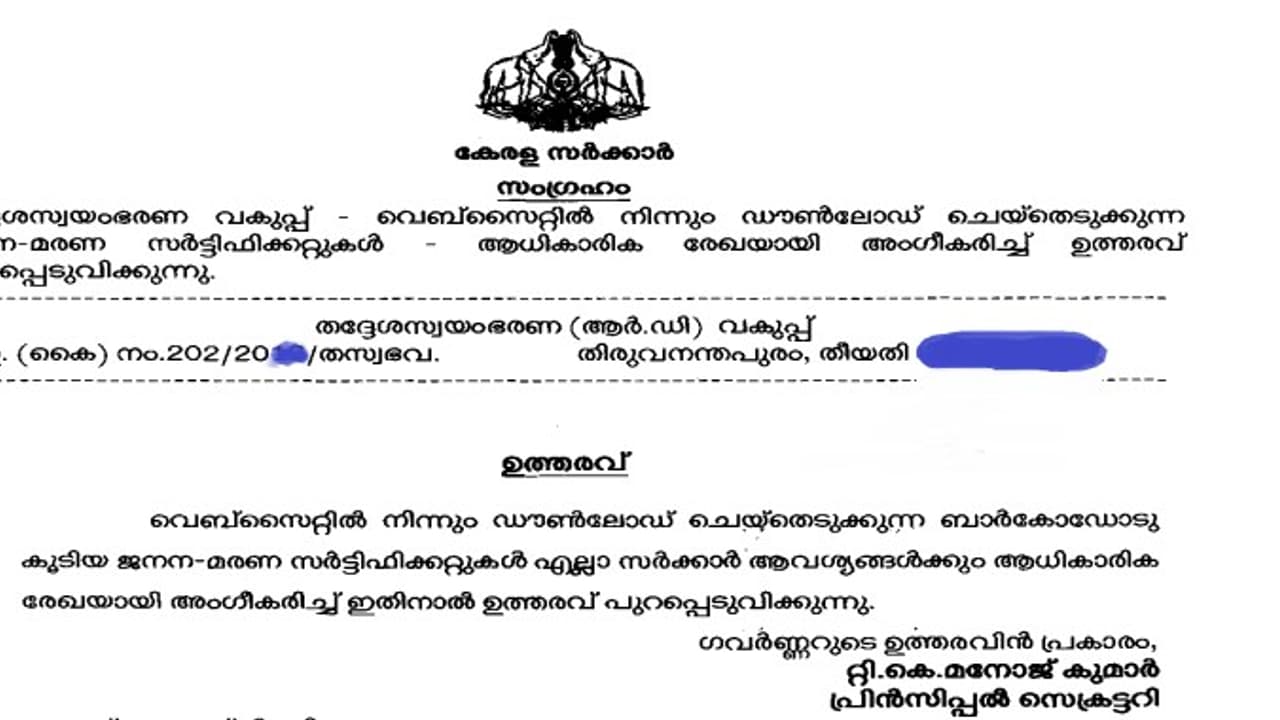 ஒரு குழந்தையின் பிறப்பு பதிவாகவில்லை. இதனால், சம்பந்தப்பட்ட துறை அதிகாரிகள், இறந்துபோன ஒருவரின் இறப்பு சான்றிதழை கொடுத்துள்ளனர். இதனால், மக்கள் அதிர்ச்சியடைந்துள்ளனர். கேரளாவில் பெரும் பரபரப்பு ஏற்பட்டள்ளது.