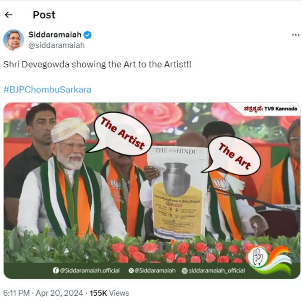 ஜனதா தளம் (மதச்சார்பற்ற) கட்சித் தலைவர் எச்.டி.தேவேகவுடா ஒரு பேரணியில் பிரதமர் நரேந்திர மோடியின் பக்கத்தில் அமர்ந்திருப்பது போல், அவரது கையில் ஒரு செய்தித்தாளையும், அதன் முதல் பக்கத்தில் காங்கிரஸின் வெற்று குவளை விளம்பரமும் காட்டப்பட்டதை அடுத்து, வார்த்தைப் போர் வெடித்தது. கர்நாடக முதல்வர் சித்தராமையா பிரதமர் மோடி மற்றும் தேவகவுடா ஆகியோரின் எடிட் செய்யப்பட்ட படத்தை X இல் பதிவிட்டு சர்ச்சையை கிளப்பினார்.