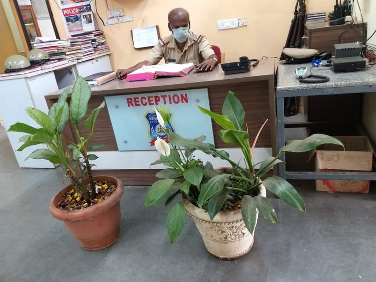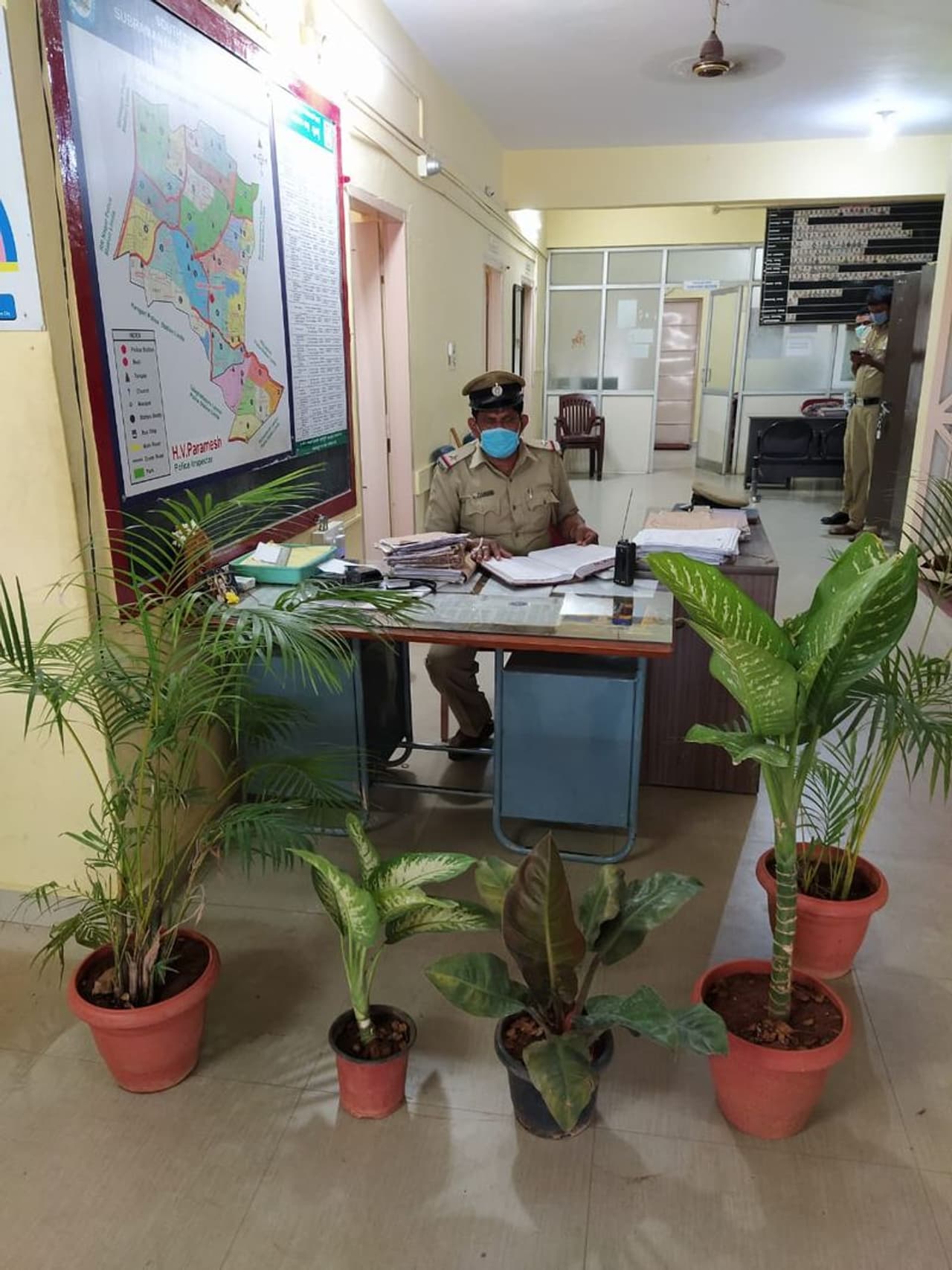 அந்தவகையில் பெங்களூரு தெற்கு துணை கமிஷனர் இஷா பண்ட் தலைமையிலான போலீஸார், காவல் நிலையத்தில் இருந்து பணியாற்றினாலும் சமூக விலகலை உறுதிப்படுத்தும் விதமாக, ஒவ்வொரு அதிகாரியின் டேபிளை சுற்றியும் பூந்தொட்டிகள் வைக்கப்பட்டுள்ளன.