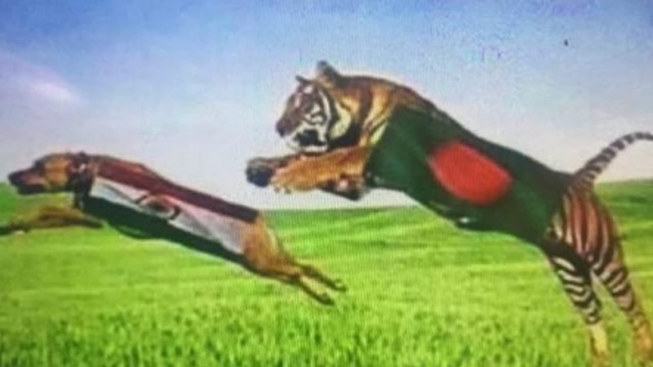வங்காளதேச அணியை கிரிக்கெட்டில் ‘புலி’ என்ற அடைமொழியில் அந்நாட்டு ரசிகர்கள் அழைப்பார்கள். அதைச் சுட்டிக்காட்டி, புலி மீது வங்காளதேசத்தின் தேசியக்கொடியை வரைந்து, நாய் படத்தின் மீது இந்திய தேசியக் கொடியை வரைந்து சிறுமைப்படுத்தி உள்ளனர்.