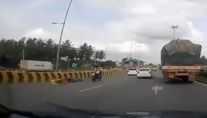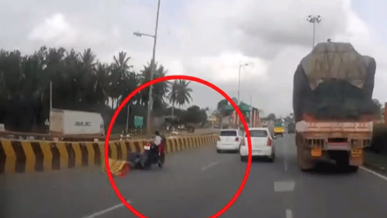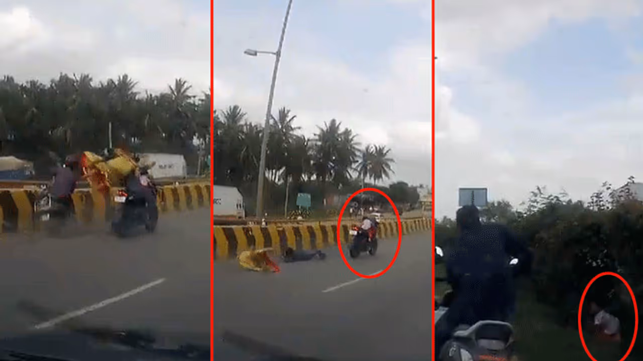 பெங்களூருவில் இருசக்கர வாகனத்தில் இருந்து தூக்கி வீசப்பட்ட குழந்தை அதிர்ஷ்டவசமாக உயிர் தப்பியது. கர்நாடக மாநிலம் பெங்களூருவை சேர்ந்த தம்பதி பரமேஸ்வர்-மனைவி ரேணுகா ஆகியோர் தங்களது குழந்தையுடன் இருசக்கர வாகனத்தில் சென்று கொண்டிருந்தார்.